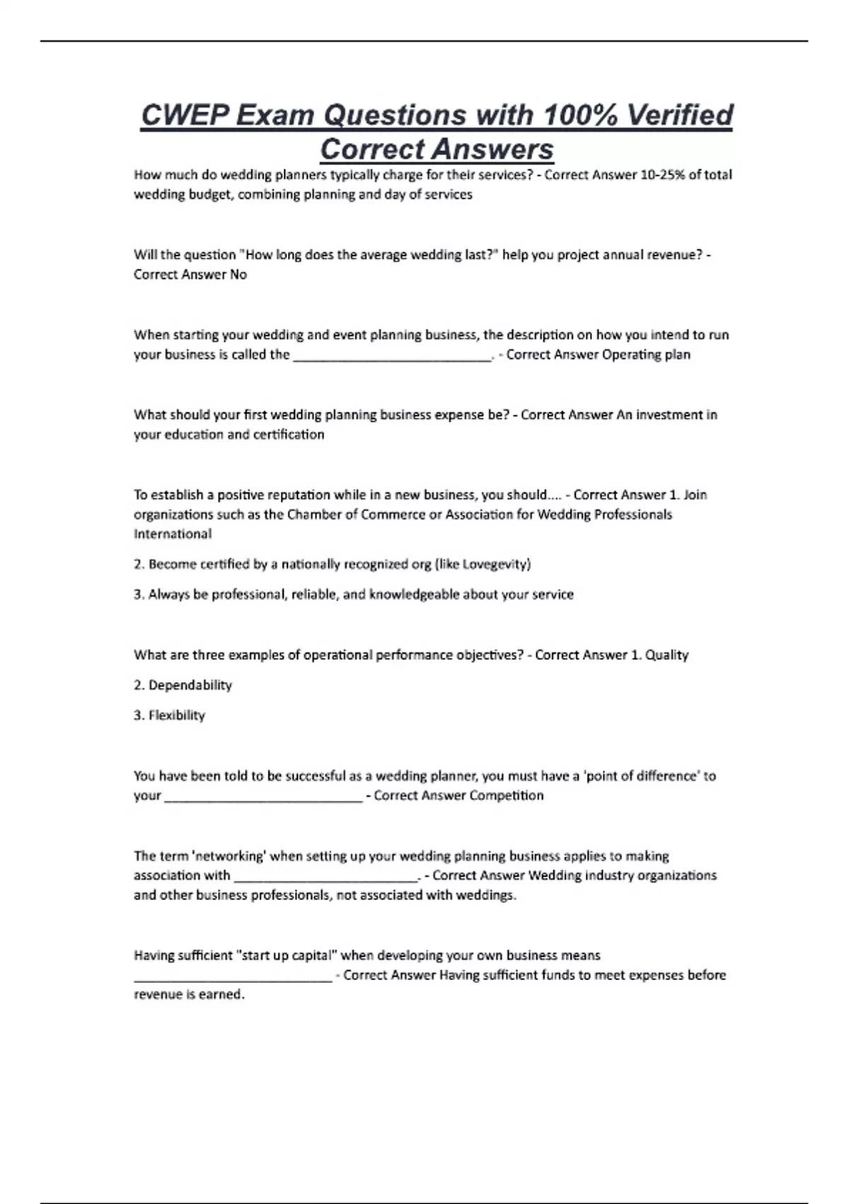 CWEP Exam Questions with 100% Verified Correct Answers How much do wedding planners typically charge for their services? - Correct Answer 10-25% of total wedding budget, combining planning and day of services Will the question "How long does the average wedding last?" help you project annual revenue? - Correct Answer No When starting your wedding and event planning business, the description on how you intend to run your business is called the ___________________________. - Correct Answer Operating plan What should your first wedding planning business expense be? - Correct Answer An investment in your education and certification To establish a positive reputation while in a new business, you should.... - Correct Answer 1. Join organizations such as the Chamber of Commerce or Association for Wedding Professionals International 2. Become certified by a nationally recognized org (like Lovegevity) 3. Always be professional, reliable, and knowledgeable about your service What are three examples of operational performance objectives? - Correct Answer 1. Quality 2. Dependability 3. Flexibility You have been told to be successful as a wedding planner, you must have a 'point of difference' to your ___________________________ - Correct Answer Competition The term 'networking' when setting up your wedding planning business applies to making association with _________________________. - Correct Answer Wedding industry organizations and other business professionals, not associated with weddings. Having sufficient "start up capital" when developing your own business means ___________________________ - Correct Answer Having sufficient funds to meet expenses before revenue is earned.