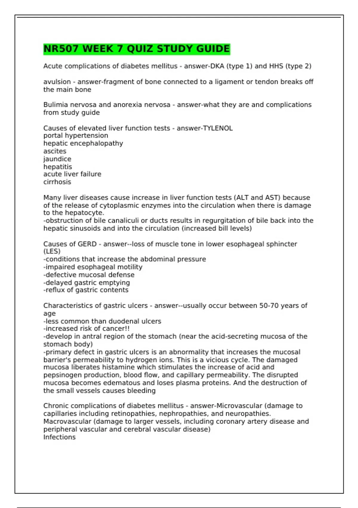NR507 WEEK 7 QUIZ STUDY GUIDE