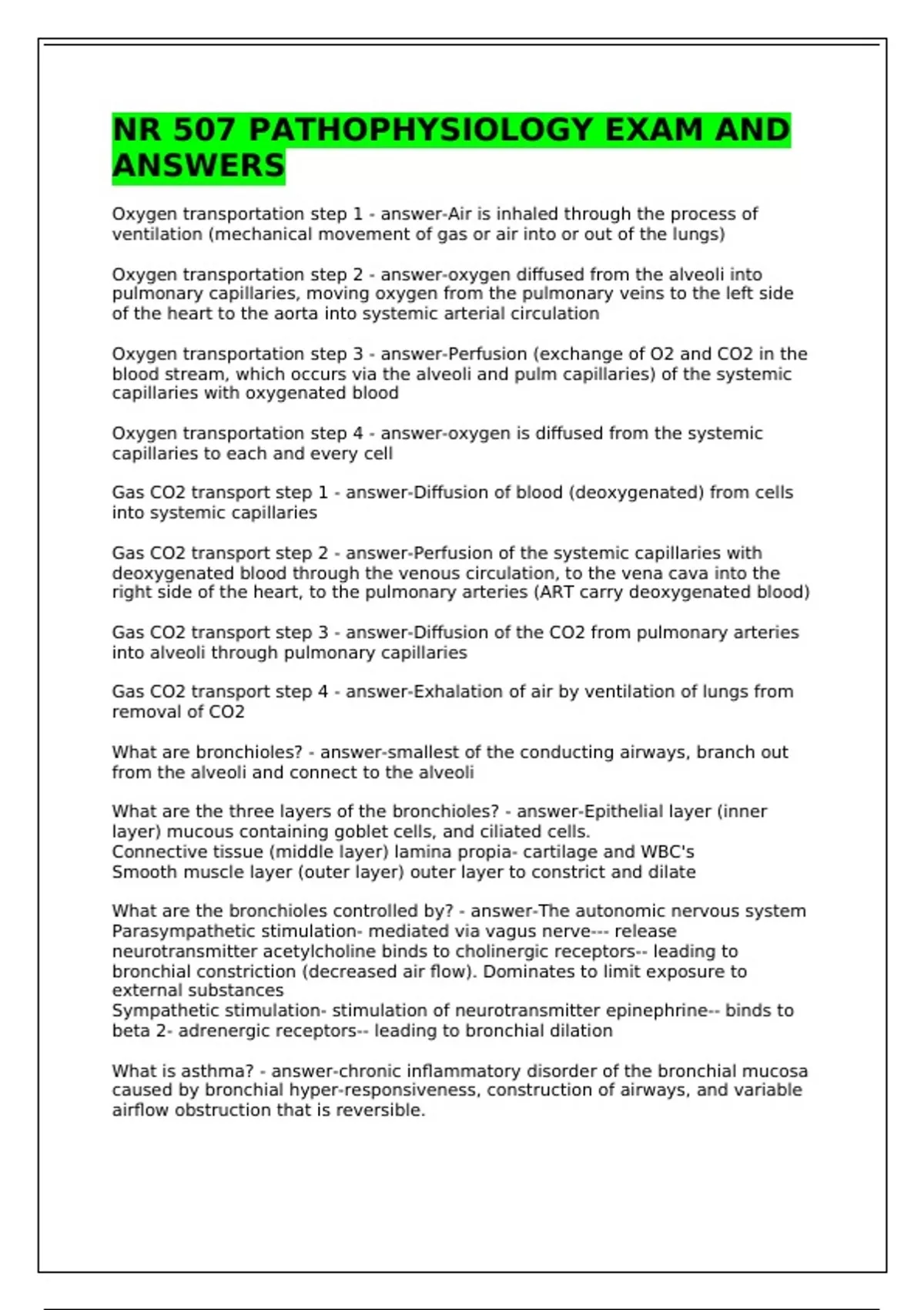 Oxygen transportation step 1 - answer-Air is inhaled through the process of ventilation (mechanical movement of gas or air into or out of the lungs) Oxygen transportation step 2 - answer-oxygen diffused from the alveoli into pulmonary capillaries, moving oxygen from the pulmonary veins to the left side of the heart to the aorta into systemic arterial circulation Oxygen transportation step 3 - answer-Perfusion (exchange of O2 and CO2 in the blood stream, which occurs via the alveoli and pulm capillaries) of the systemic capillaries with oxygenated blood Oxygen transportation step 4 - answer-oxygen is diffused from the systemic capillaries to each and every cell Gas CO2 transport step 1 - answer-Diffusion of blood (deoxygenated) from cells into systemic capillaries Gas CO2 transport step 2 - answer-Perfusion of the systemic capillaries with deoxygenated blood through the venous circulation, to the vena cava into the right side of the heart, to the pulmonary arteries (ART carry deoxygenated blood) Gas CO2 transport step 3 - answer-Diffusion of the CO2 from pulmonary arteries into alveoli through pulmonary capillaries Gas CO2 transport step 4 - answer-Exhalation of air by ventilation of lungs from removal of CO2 What are bronchioles? - answer-smallest of the conducting airways, branch out from the alveoli and connect to the alveoli What are the three layers of the bronchioles? - answer-Epithelial layer (inner layer) mucous containing goblet cells, and ciliated cells. Connective tissue (middle layer) lamina propia- cartilage and WBC's Smooth muscle layer (outer layer) outer layer to constrict and dilate What are the bronchioles controlled by? - answer-The autonomic nervous system Parasympathetic stimulation- mediated via vagus nerve--- release neurotransmitter acetylcholine binds to cholinergic receptors-- leading to bronchial constriction (decreased air flow). Dominates to limit exposure to external substances Sympathetic stimulation- stimulation of neurotransmitter epinephrine-- binds to beta 2- adrenergic receptors-- leading to bronchial dilation What is asthma? - answer-chronic inflammatory disorder of the bronchial mucosa caused by bronchial hyper-responsiveness, construction of airways, and variable airflow obstruction that is reversible. Asthma signs and symptoms - answer-Those are asymptomatic between attacks. Beginning of attacks--chest constriction, expiratory wheezing, dyspnea, nonproductive coughing, prolonged expiration, tachypnea, and tachycardia Severe attacks-- use of accessory muscles of respiration, wheezing during both inspiration/expiration, pulsus paradoxus- decrease in SBP during inspiration Anti-cholingeric drugs for asthma - answer-Tiotropium and Ipratropium- these drugs block acetylcholine binding--- leading to bronchodilation through decrease in the parasympathetic response What causes bronchitis and associated pathogenesis? - answer-acute causes- infection or inflammation chronic causes- usually caused by viruses with a nonproductive cough Chronic bronchitis - answer-Inflammation of the bronchi persisting over a long time. Productive cough that continues for at least three months for a year for 2 years consecutive years. Enhanced chronic inflammatory response in the airways to noxious particles or gases. Inspired irritants-- bronchial inflammation-- bronchial edema increase in mucous glands and goblet ells in airway, smooth muscle hypertrophy with fibrosis, narrowing of airways Hypersecretion of thick muscus and cannot be cleared due to impaired ciliary function-- increasing susceptibility to infection contributing to airway injury and ineffective repair. Initially only affects larger bronchi-- eventually all airways involved Chronic bronchitis and acid/base disturbances - answer-narrowed airway--obstruction-- ventilation-perfusion mismatch with hypoxemia Hypercapnia develops as air trapping worsens and the work of breathing increase Reduced tidal volumes-hypoventilation-- respiratory acidosis Polycythemia vera - answer-chronic neoplastic, nonmalignant condition that is characterized by overproduction of red blood cells (often with an increase levels of WBC and platelets) and splenomegaly chronic bronchitis (marked hypoxemia) leads to ... - answer-polycythemia and cyanosis what is an essential component of polycythemia vera - answer-Erythrocytosis; clonal proliferation of erythoid progenitors occurs in the bone marrow independent of erythropoietin, even though the cells express a normal erythropoietin receptor alveolar hyperinflation with asthma - answer-airway obstruction increases airflow resistance and decreases flow rate--- impaired expiration causes air trapping, hyperinflation distal to obstruction and increased work of breathing-- continued air trapping increase intrapleural pressure and alveolar gas pressures-- decreased alveolar perfusion-- hyperventilation is triggered in response to increased lung volume and obstruction (early hypoxemia without Co2 retention and respiratory alkalosis)-- With progressive obstruction of expiratory airflow, airflow trapping more air leading to lungs and thorax hyperexanded, decrease respiratory muscles resulting in a decrease tidal volume and increase in CO2 retention-- causing respiratory acidosis Blood flow between heart and lungs - answer-The superior and inferior vena cava carry systemic DEoxygenated blood to the right atrium-- the tricuspid valve opens to allow for blood flow into the right ventricle-- the pulmonary semilunar valve opens to allow blood flow into the pulmonary truck; a large blood vessel that divides to form the left and right pulmonary arteries that carry blood to the lungs and eventually into the alveolar capillaries where gas exchange occurs-- The pulmonary veins return oxygenated blood to the left atrium-- the bicuspid valve opens to allow blood flow into the left ventricle-- the aortic semilunar valve opens to allow blood flow into the aorta; a large blood vessel that divides into brachiocephalic, l