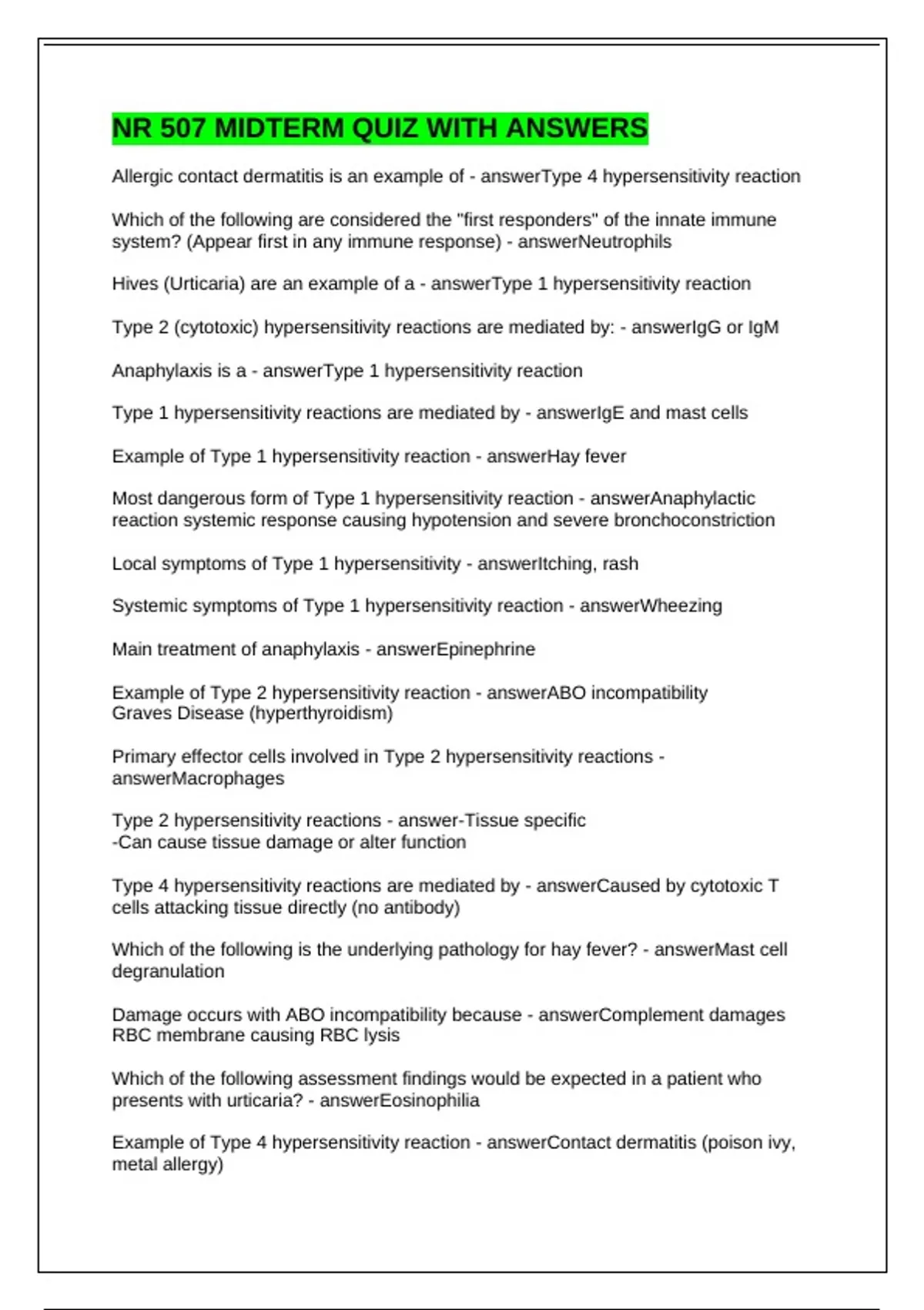 Allergic contact dermatitis is an example of - answerType 4 hypersensitivity reaction Which of the following are considered the "first responders" of the innate immune system? (Appear first in any immune response) - answerNeutrophils Hives (Urticaria) are an example of a - answerType 1 hypersensitivity reaction Type 2 (cytotoxic) hypersensitivity reactions are mediated by: - answerIgG or IgM Anaphylaxis is a - answerType 1 hypersensitivity reaction Type 1 hypersensitivity reactions are mediated by - answerIgE and mast cells Example of Type 1 hypersensitivity reaction - answerHay fever Most dangerous form of Type 1 hypersensitivity reaction - answerAnaphylactic reaction systemic response causing hypotension and severe bronchoconstriction Local symptoms of Type 1 hypersensitivity - answerItching, rash Systemic symptoms of Type 1 hypersensitivity reaction - answerWheezing Main treatment of anaphylaxis - answerEpinephrine Example of Type 2 hypersensitivity reaction - answerABO incompatibility Graves Disease (hyperthyroidism) Primary effector cells involved in Type 2 hypersensitivity reactions - answerMacrophages Type 2 hypersensitivity reactions - answer-Tissue specific -Can cause tissue damage or alter function Type 4 hypersensitivity reactions are mediated by - answerCaused by cytotoxic T cells attacking tissue directly (no antibody) Which of the following is the underlying pathology for hay fever? - answerMast cell degranulation Damage occurs with ABO incompatibility because - answerComplement damages RBC membrane causing RBC lysis Which of the following assessment findings would be expected in a patient who presents with urticaria? - answerEosinophilia Example of Type 4 hypersensitivity reaction - answerContact dermatitis (poison ivy, metal allergy) Type 3 hypersensitivity reactions - answer- Are NOT organ specific - antigen-antibody complex deposited in tissues Type 3 hypersensitivity reaction examples - answerRheumatoid Arthritis Systemic Lupus Erythematous (SLE) Scope of Damage of SLE - answer- Facial rash confined to the cheeks (malar rash) - Discoid rash (raised patches, scaling) - photosensitivity (development of skin rash as a results of sunlight exposure) - oral or nasopharyngeal ulcers - hematologic disorders (hemolytic anemia, leukopenia, lymphopenia, or thrombocytopenia) - immunologic disorders (antibodies against double-stranded DNA or Smith antigen, false positive serologic tests for syphilis, or antiphospholipid antibodies) - Non-erosive arthritis of at least 2 peripheral joints - Serositis (pleurisy, pericarditis) - renal disorder (persistent proteinuria of > 0.5 g/day or > 3 g/day on dipstick of cellular casts) - neurological disorders (seizures, psychosis) - presence of antinuclear antibody (ANA) Autoimmune diseases can be - answerFamilial although not all develop the same disease, but several members may have different disorders characterized by a variety of hypersensitivity reactions Associations with particular autoimmune diseases have been identified for a variety of - answerMajor histocompatibility complex (MHC) alleles or non-MHC genes Alloimmunity - answerGeneral term used to describe when an individuals immune system reactions against antigens on the tissues of other members of the same species Examples of alloimmunity - answer- Neonatal disease where the maternal immune system becomes sensitized against antigens expressed by the fetus - transplant rejection - transfusion reaction A rash in Type 1 hypersensitivity reaction - answerImmediate reaction, termed atopic dermatitis, usually characterized by widely distributed lesions A rash in Type 4 hypersensitivity reaction - answerContact dermatitis (delayed hypersensitivity) consists of lesions only at the site of contact with the allergen Best choice of treatment for Type 4 rash - answerTopical corticosteroids An example of primary immunodeficiency is: - answerChronic granulomatous disease Is a predominant cause of secondary immune deficiencies worldwide - answerMalnutrition Which of the following is an autoimmune disease? - answerSystemic lupus erythematosus (SLE) Primary immunodeficiencies - answerAre the result of a single gene defect Example of primary immunodeficiency - answer- chronic granulomatous disease of childhood - DiGeorge syndrome - Familial Mediterranean fever - job syndrome - common variable immunodeficiency Example of secondary immunodeficiency - answer- Human Immunodeficiency Virus - pneumocystis carinii - pneumonia - sinus infection - lung cancer Pneumocystis Carinii is an example of - answerA secondary immune disease Best describes a primary immunodeficiency - answerAre less common and occur due to a defect on the development of the immune system Most severe form of primary immunodeficiency - answerB-lymphocyte deficiency The major immune system change associated with Sjögren's syndrome is: - answerAutoantibodies and auto-reactive T-cells against apoptotic cells What can depress a persons normal immune system - answerStress A renal disease most often associated with autoimmunity is: - answerGlomerulonephritis Is positive in 90% of patients diagnosed with SLE? - answerThe antinuclear antibody (ANA) Does not automatically indicate the development of a full autoimmune disease - answerLow number of antibodies The following immune components can be involved in autoimmune diseases: - answerT-cells, B-cells, and autoantibodies Which of the following assessment findings would support a diagnosis of Rheumatoid Arthritis? - answerSwollen metacarpophalangeal joints Which of the following microcytic anemias is characterized by hyperchromic RBCs? - answerhereditary spherocytosis Clinical characteristic of anemia - answerPallor Fatigue Dyspnea Which of the following indices measures the average size of red blood cells? - answerMean corpuscular volume (MCV) Which of the following is considered a microcytic anemia? - answerIron deficiency anemia The terms normocytic, microcytic, and macrocytic characterizes re