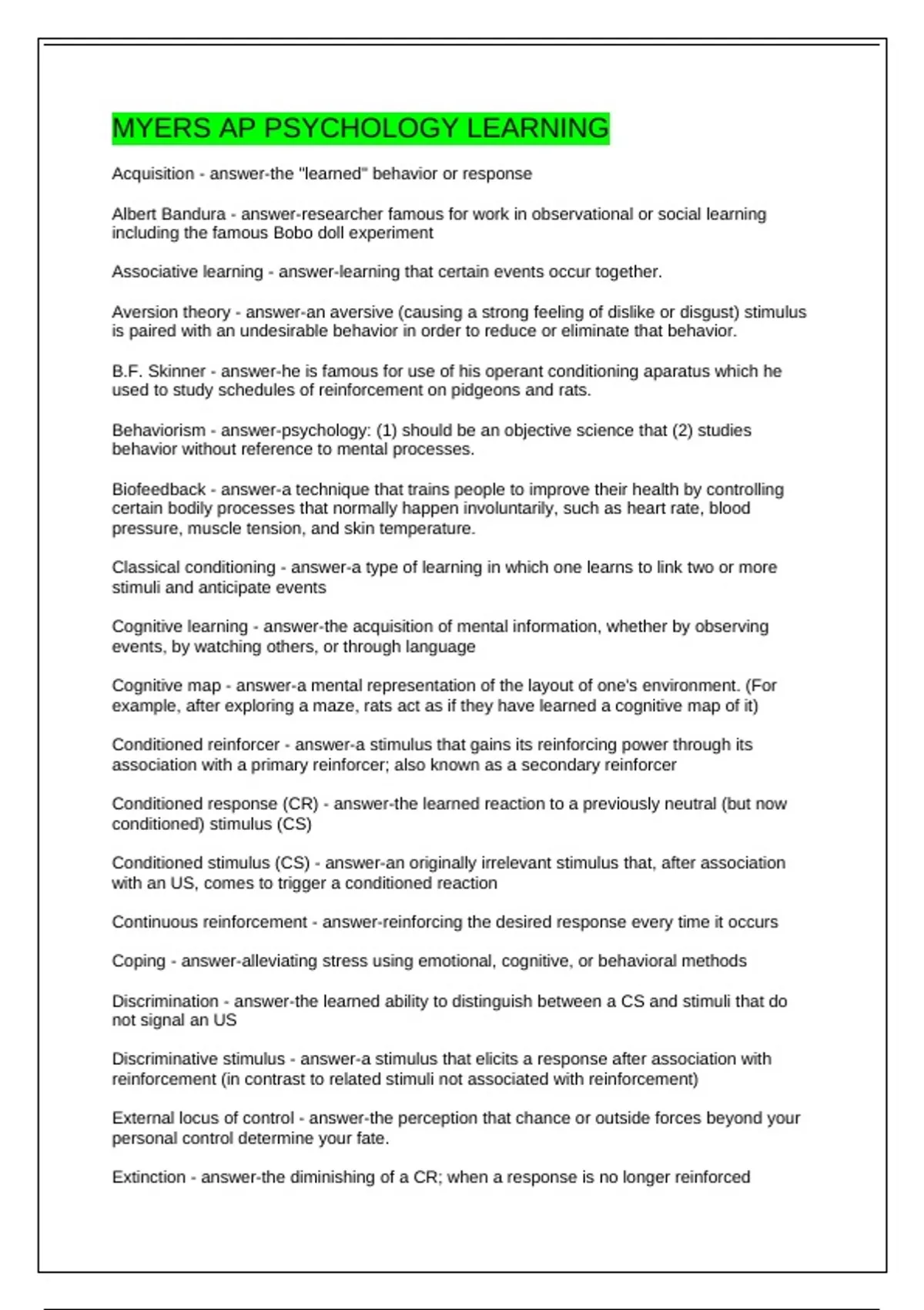 Acquisition - answer-the "learned" behavior or response Albert Bandura - answer-researcher famous for work in observational or social learning including the famous Bobo doll experiment Associative learning - answer-learning that certain events occur together. Aversion theory - answer-an aversive (causing a strong feeling of dislike or disgust) stimulus is paired with an undesirable behavior in order to reduce or eliminate that behavior. B.F. Skinner - answer-he is famous for use of his operant conditioning aparatus which he used to study schedules of reinforcement on pidgeons and rats. Behaviorism - answer-psychology: (1) should be an objective science that (2) studies behavior without reference to mental processes. Biofeedback - answer-a technique that trains people to improve their health by controlling certain bodily processes that normally happen involuntarily, such as heart rate, blood pressure, muscle tension, and skin temperature. Classical conditioning - answer-a type of learning in which one learns to link two or more stimuli and anticipate events Cognitive learning - answer-the acquisition of mental information, whether by observing events, by watching others, or through language Cognitive map - answer-a mental representation of the layout of one's environment. (For example, after exploring a maze, rats act as if they have learned a cognitive map of it) Conditioned reinforcer - answer-a stimulus that gains its reinforcing power through its association with a primary reinforcer; also known as a secondary reinforcer Conditioned response (CR) - answer-the learned reaction to a previously neutral (but now conditioned) stimulus (CS) Conditioned stimulus (CS) - answer-an originally irrelevant stimulus that, after association with an US, comes to trigger a conditioned reaction Continuous reinforcement - answer-reinforcing the desired response every time it occurs Coping - answer-alleviating stress using emotional, cognitive, or behavioral methods Discrimination - answer-the learned ability to distinguish between a CS and stimuli that do not signal an US Discriminative stimulus - answer-a stimulus that elicits a response after association with reinforcement (in contrast to related stimuli not associated with reinforcement) External locus of control - answer-the perception that chance or outside forces beyond your personal control determine your fate. Extinction - answer-the diminishing of a CR; when a response is no longer reinforced Extrinsic motivation - answer-a desire to perform a behavior to receive promised rewards or avoid threatened punishment, OUTSIDE Fixed-interval schedule - answer-a reinforcement schedule that reinforces a response only after a specified time has elapsed Fixed-ratio schedule - answer-a reinforcement schedule that reinforces a response only after a specified number of responses Generalization - answer-the tendency, once a response has been conditioned, for stimuli similar to the CS to elicit responses Habituation - answer-an organism's decreasing response to a stimulus with repeated exposure to it Higher-order conditioning - answer-a procedure in which the CS in one conditioning experience is paired with a new NS, creating a second (often weaker) CS. Insight - answer-a sudden and often novel realization of the solution to a problem Internal locus of control - answer-the perception that you control your own fate Intrinsic motivation - answer-a desire to perform a behavior effectively for its own sake; INSIDE Ivan Pavlov - answer-Russian physiologist who observed conditioned salivary responses in dogs () John Garcia - answer-Researched taste aversion. Showed that when rats ate a novel substance before being nauseated by a drug or radiation, they developed a conditioned taste aversion for the substance. John Watson - answer-behaviorist; famous for Little Albert study in which a baby was taught to fear a white rat Latent learning - answer-learning that occurs but is not apparent until there is an incentive to demonstrate it LATER Law of effect - answer-Thorndike's principle that behaviors followed by favorable consequences become more likely, or where behaviors followed by unfavorable consequences become less likely Learned helplessness - answer-the hopelessness and passive resignation an animal or human learns when unable to avoid repeated aversive events Learned helplessness - answer-the hopelessness and passive resignation an animal or human learns when unable to avoid repeated aversive events Learning - answer-a relatively permanent change in an organism's behavior due to experience Little albert - answer-subject in John Watson's experiment, proved classical conditioning principles, especially the generalization of fear Mirror neurons - answer-frontal lobe neurons that fire when performing certain actions or when observing another doing so. The brain's mirroring of another's actions may enable imitation and empath Modeling - answer-the process of observing and imitating a specific behavior Negative reinforcement - answer-increasing behaviors by stopping or reducing negative stimuli, such as shock. Neutral stimulus (NS) - answer-environmental factor that doesn't elicit a CR until it is repeatedly paired with the US (ex/ bell in Pavlov experiment) Observational learning - answer-learning by observing others; also called social learning Operant chamber - answer-Skinner box containing a bar or key that an animal can manipulate to obtain food or water reinforce; attached devices record the animal's rate of bar pressing or key pecking Operant conditioning - answer-a type of learning in which behavior is strengthened if followed by a reinforcer or diminished followed by a punisher Partial (intermittent) reinforcement - answer-reinforcing a response only part of the time; results in slower acquisition of a response but much greater resistance to extinction than does continuous reinforcement