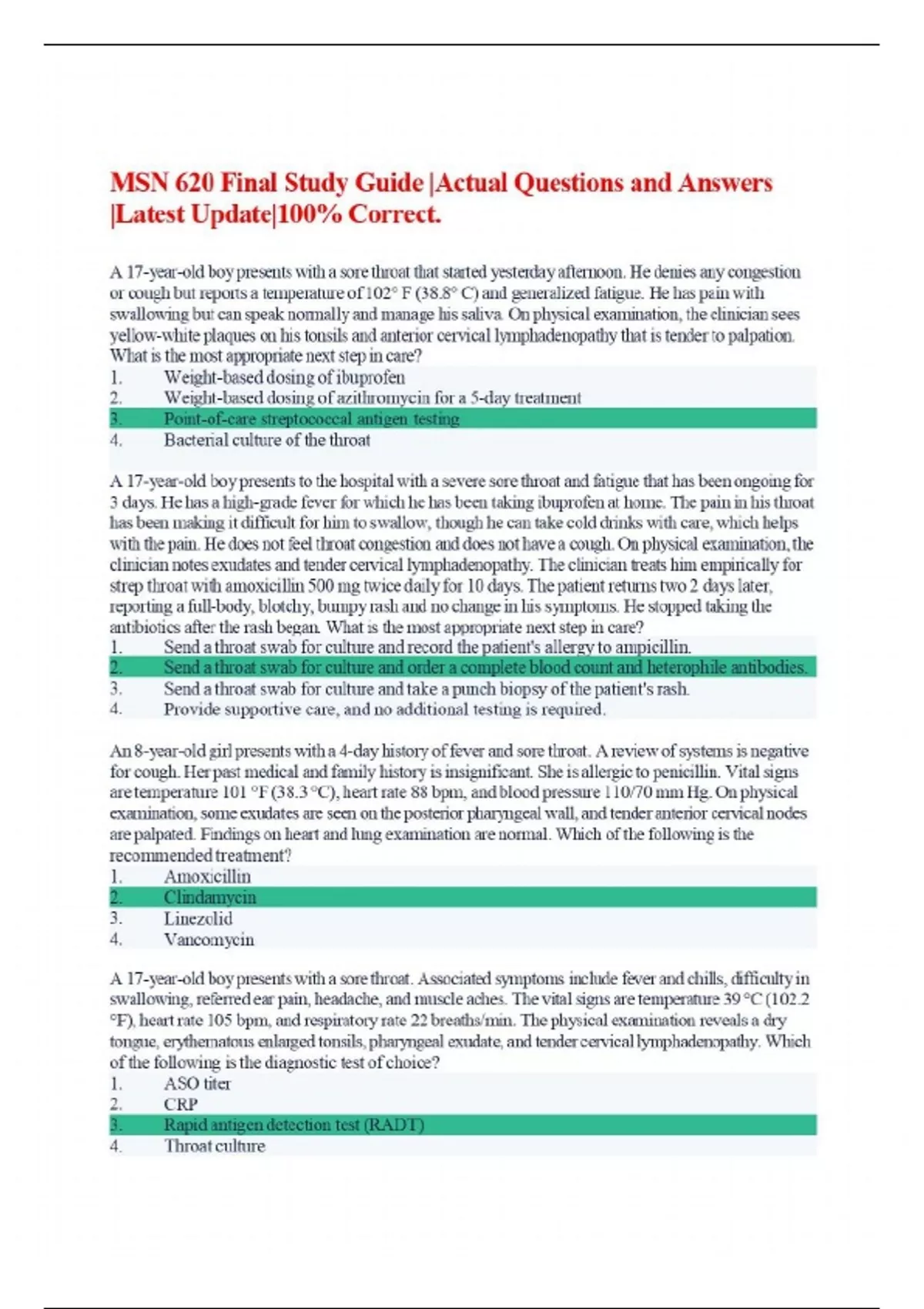 MSN 620 Final Study Guide |Actual Questions and Answers |Latest Update|100% Correct. A 17-year-old boy presents with a sore throat that started yesterday afternoon. He denies any congestion or cough but reports a temperature of 102° F (38.8° C) and generalized fatigue. He has pain with swallowing but can speak normally and manage his saliva. On physical examination, the clinician sees yellow-white plaques on his tonsils and anterior cervical lymphadenopathy that is tender to palpation. What is the most appropriate next step in care? A 17-year-old boy presents to the hospital with a severe sore throat and fatigue that has been ongoing for 3 days. He has a high-grade fever for which he has been taking ibuprofen at home. The pain in his throat has been making it difficult for him to swallow, though he can take cold drinks with care, which helps with the pain. He does not feel throat congestion and does not have a cough. On physical examination, the clinician notes exudates and tender cervical lymphadenopathy. The clinician treats him empirically for strep throat with amoxicillin 500 mg twice daily for 10 days. The patient returns two 2 days later, reporting a full-body, blotchy, bumpy rash and no change in his symptoms. He stopped taking the antibiotics after the rash began. What is the most appropriate next step in care? An 8-year-old girl presents with a 4-day history of fever and sore throat. A review of systems is negative for cough. Her past medical and family history is insignificant. She is allergic to penicillin. Vital signs are temperature 101 °F (38.3 °C), heart rate 88 bpm, and blood pressure 110/70 mm Hg. On physical examination, some exudates are seen on the posterior pharyngeal wall, and tender anterior cervical nodes are palpated. Findings on heart and lung examination are normal. Which of the following is the recommended treatment? A 17-year-old boy presents with a sore throat. Associated symptoms include fever and chills, difficulty in swallowing, referred ear pain, headache, and muscle aches. The vital signs are temperature 39 °C (102.2 °F), heart rate 105 bpm, and respiratory rate 22 breaths/min. The physical examination reveals a dry tongue, erythematous enlarged tonsils, pharyngeal exudate, and tender cervical lymphadenopathy. Which of the following is the diagnostic test of choice? A 17-year-old girl presents with a thick discharge from her eyes that started 5 days ago. Associated symptoms include redness and a feeling of dirt in her eyes. Her eyes are usually matted in the morning. Her medical history is significant for multiple similar episodes. She has been using contact lenses for the past 2 years. Her vital signs are blood pressure 120/80 mm Hg, heart rate 88 bpm, respiratory rate 14 breaths/min, and temperature 37 °C (98.6 °F). An ocular examination reveals hyperemia and elevated yellow-white lesions at the lower cul-de-sac. What is the most appropriate next step in management? A 6-year-old girl is brought in with a 5-day history of sore throat and fever. Other children at school have had similar symptoms. She has not had any cough during this time. Her medical and family history is insignificant. Her vitals are currently within normal limits. On physical examination, her anterior cervical nodes are palpable and tender. There are no exudates seen on the posterior pharyngeal wall. What is the next best step in the management of this patient? A 46-year-old man presents with symptoms consistent with allergic rhinitis. He has a history of depression and is treated with a selective serotonin reuptake inhibitor. He works as a school bus driver. Which of the following should be used to treat his symptoms? A 5-year-old boy is brought for evaluation of a sore throat for the past 5 days. His parents report no cough during this period. His medical and family history is insignificant. Vitals show blood pressure 120/80 mm Hg, temperature of 100.4 °F (38 °C), and heart rate 78 bpm. On physical examination, anterior cervical nodes are palpable and tender. Exudates are seen on the posterior pharyngeal wall. A rapid antigen test was performed, which came back negative. Which of the following is the next best step in management? A 16-year-old male presents with a 2 day history of sore throat, fever, and cough. He has been experiencing difficulty swallowing food for the last two days. He has otherwise been in good health and is up to date with his immunizations. On examinations, he has a temperature of 100.6 F, pulse rate of 100 bpm, blood pressure of 110/80 mmHg. Oral exam reveals bilateral tonsillar exudates and diffuse pharyngeal erythema. Which of the following would be the next best step in the management of this patient? A 27-year-old man presents with fever, sore throat, and a generalized maculopapular erythematous rash. He reports having sexual relations with other men. His rapid antigen test for Group A beta- hemolytic streptococcus is negative. What is the next best step in the management of this patient? A 2-year-old boy presents with a fever of 102 °F (38.9 °C). His physical examination reveals bilateral otitis media with effusion with noted erythema on the right side. His parents state that this is his sixth diagnosis of otitis media in the past 12 months. His parents also note that he only has 2 words that are intelligible to them. Following the treatment of this patient for his acute otitis media, which of the following is an appropriate management strategy? Despite trying to manage a child diagnosed with otitis media with effusion conservatively, it is decided an intervention is necessary. Following consultation with an otolaryngologist, it is decided to proceed with the placement of bilateral ventilation tubes. Informed consent is obtained from the parents. Which of the following is the most likely complication of tympanostomy tube placement? A 35-year-old man with nasal congestion continues to use an over-the-counter intranasal decongestant for four we