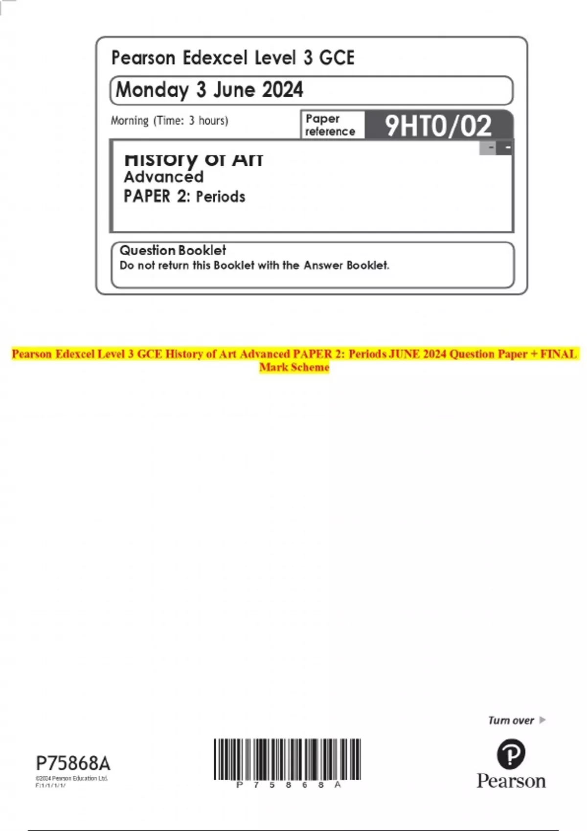 Pearson Edexcel Level 3 GCE History of Art Advanced PAPER 2: Periods JUNE 2024 Question Paper + FINAL Mark Scheme