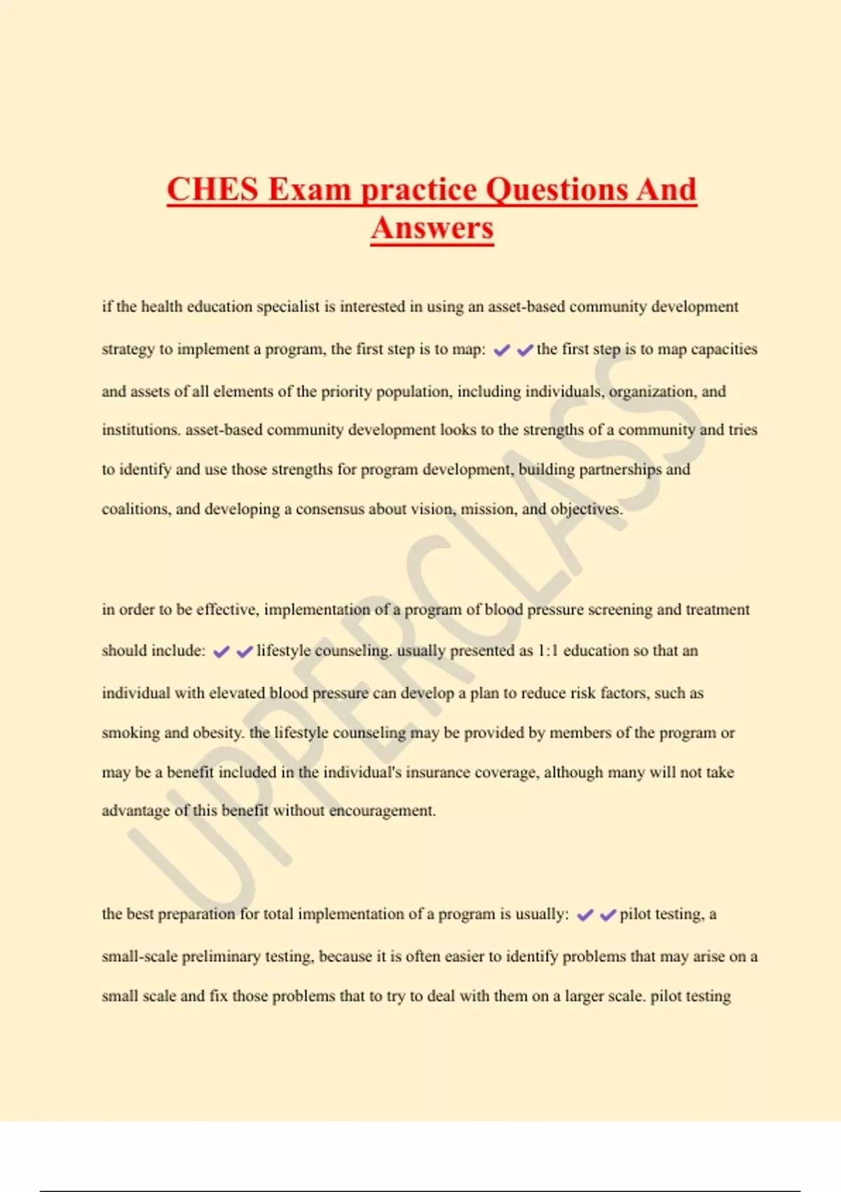 CHES Exam practice Questions And Answers if the health education specialist is interested in using an asset-based community development strategy to implement a program, the first step is to map: the first step is to map capacities and assets of all elements of the priority population, including individuals, organization, and institutions. asset-based community development looks to the strengths of a community and tries to identify and use those strengths for program development, building partnerships and coalitions, and developing a consensus about vision, mission, and objectives. in order to be effective, implementation of a program of blood pressure screening and treatment should include: lifestyle counseling. usually presented as 1:1 education so that an individual with elevated blood pressure can develop a plan to reduce risk factors, such as smoking and obesity. the lifestyle counseling may be provided by members of the program or may be a benefit included in the individual's insurance coverage, although many will not take advantage of this benefit without encouragement.