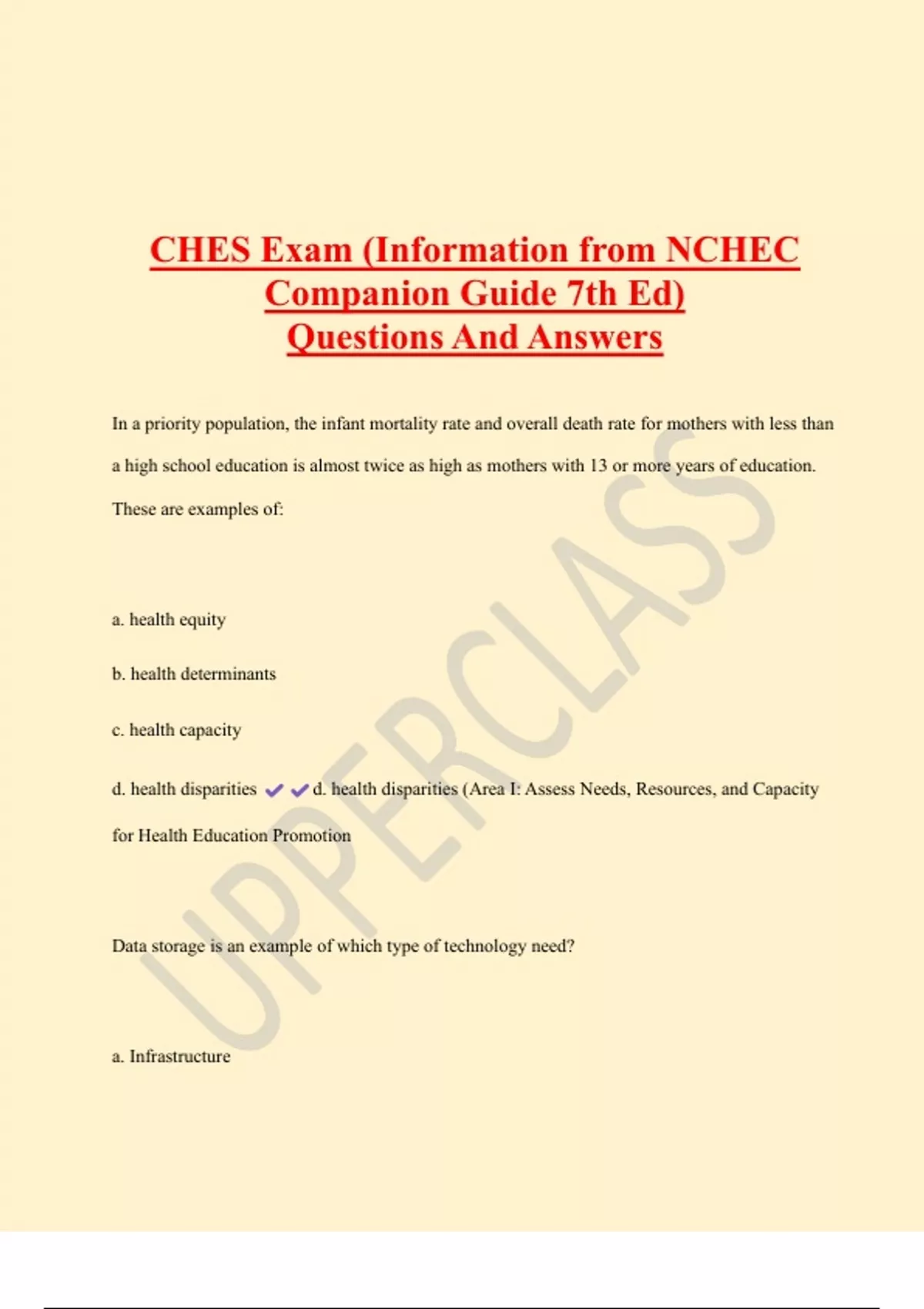 CHES Exam (Information from NCHEC Companion Guide 7th Ed) Questions And Answers In a priority population, the infant mortality rate and overall death rate for mothers with less than a high school education is almost twice as high as mothers with 13 or more years of education. These are examples of: a. health equity b. health determinants c. health capacity d. health disparities d. health disparities (Area I: Assess Needs, Resources, and Capacity for Health Education Promotion