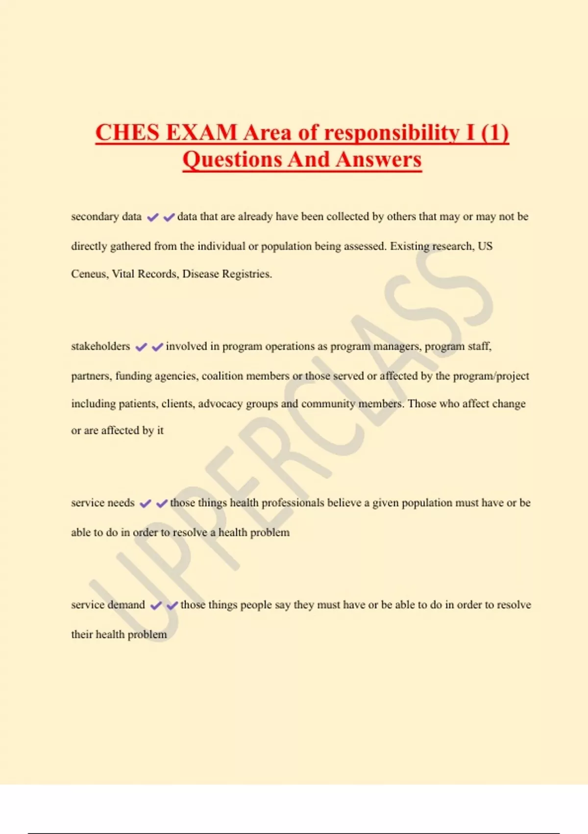 CHES EXAM Area of responsibility I (1) Questions And Answers secondary data data that are already have been collected by others that may or may not be directly gathered from the individual or population being assessed. Existing research, US Ceneus, Vital Records, Disease Registries. stakeholders involved in program operations as program managers, program staff, partners, funding agencies, coalition members or those served or affected by the program/project including patients, clients, advocacy groups and community members. Those who affect change or are affected by it service needs those things health professionals believe a given population must have or be able to do in order to resolve a health problem