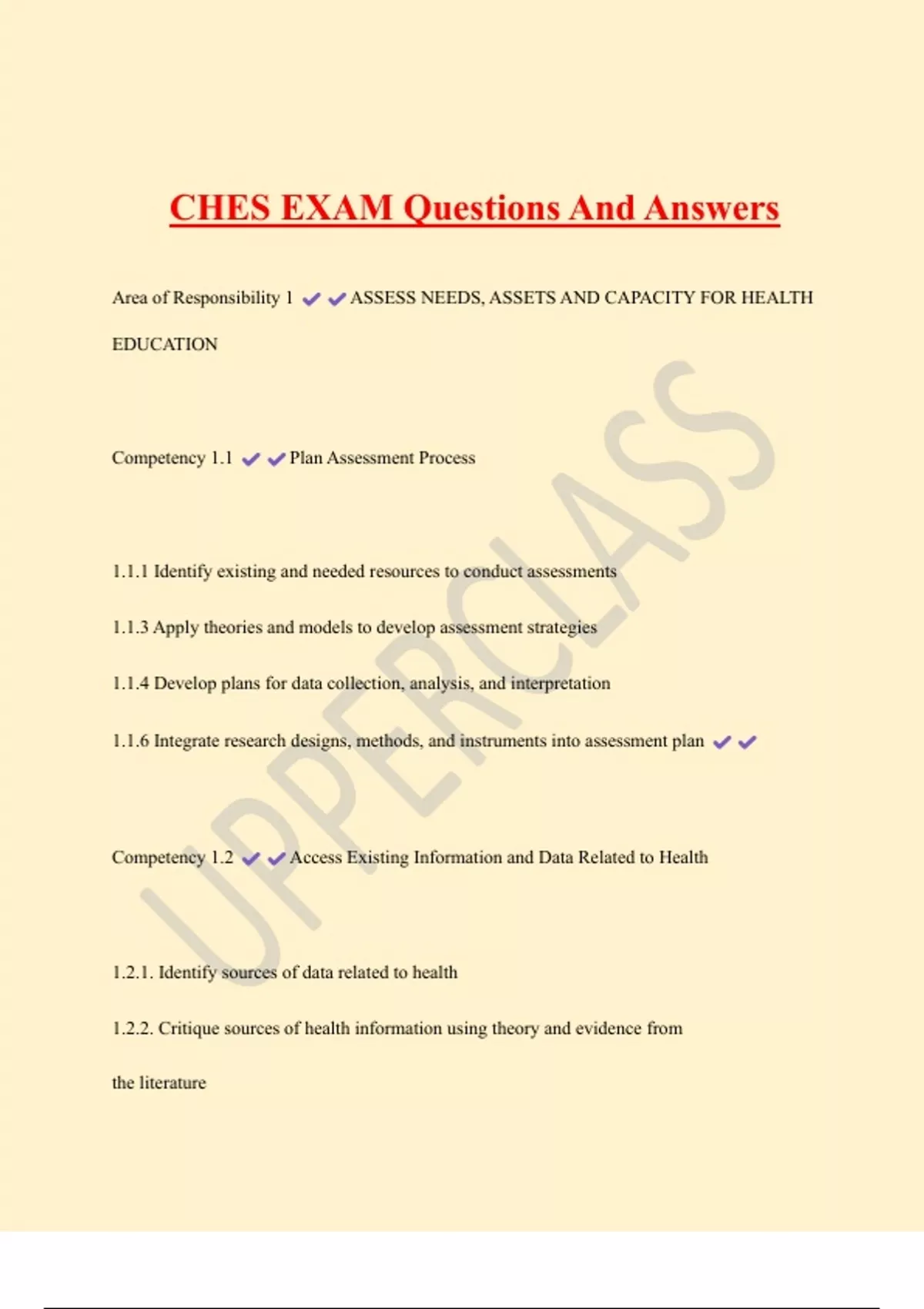 CHES EXAM Questions And Answers Area of Responsibility 1 ASSESS NEEDS, ASSETS AND CAPACITY FOR HEALTH EDUCATION Competency 1.1 Plan Assessment Process 1.1.1 Identify existing and needed resources to conduct assessments 1.1.3 Apply theories and models to develop assessment strategies 1.1.4 Develop plans for data collection, analysis, and interpretation 1.1.6 Integrate research designs, methods, and instruments into assessment plan Competency 1.2 Access Existing Information and Data Related to Health