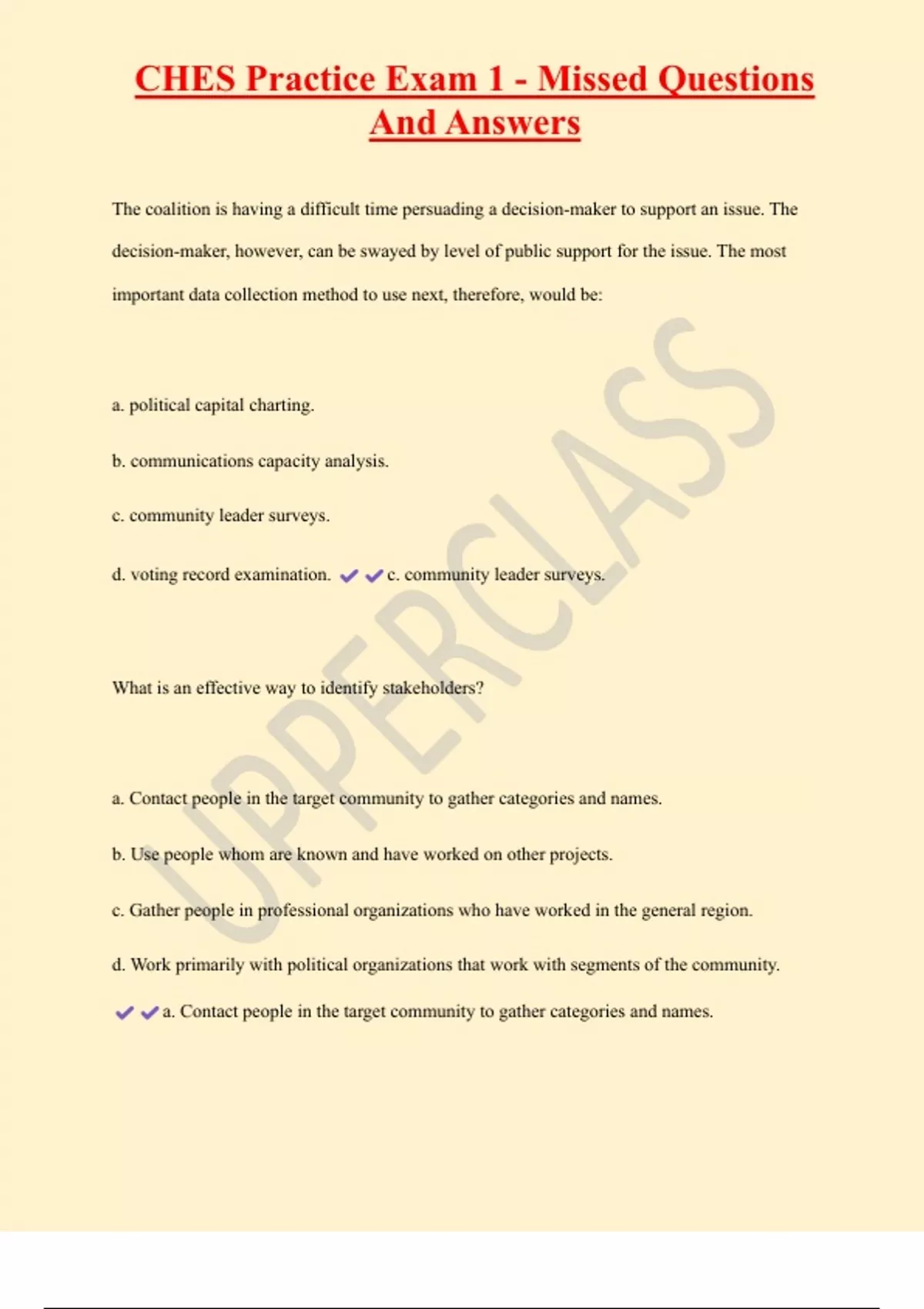CHES Practice Exam 1 - Missed Questions And Answers The coalition is having a difficult time persuading a decision-maker to support an issue. The decision-maker, however, can be swayed by level of public support for the issue. The most important data collection method to use next, therefore, would be: a. political capital charting. b. communications capacity analysis. c. community leader surveys. d. voting record examination. c. community leader surveys.