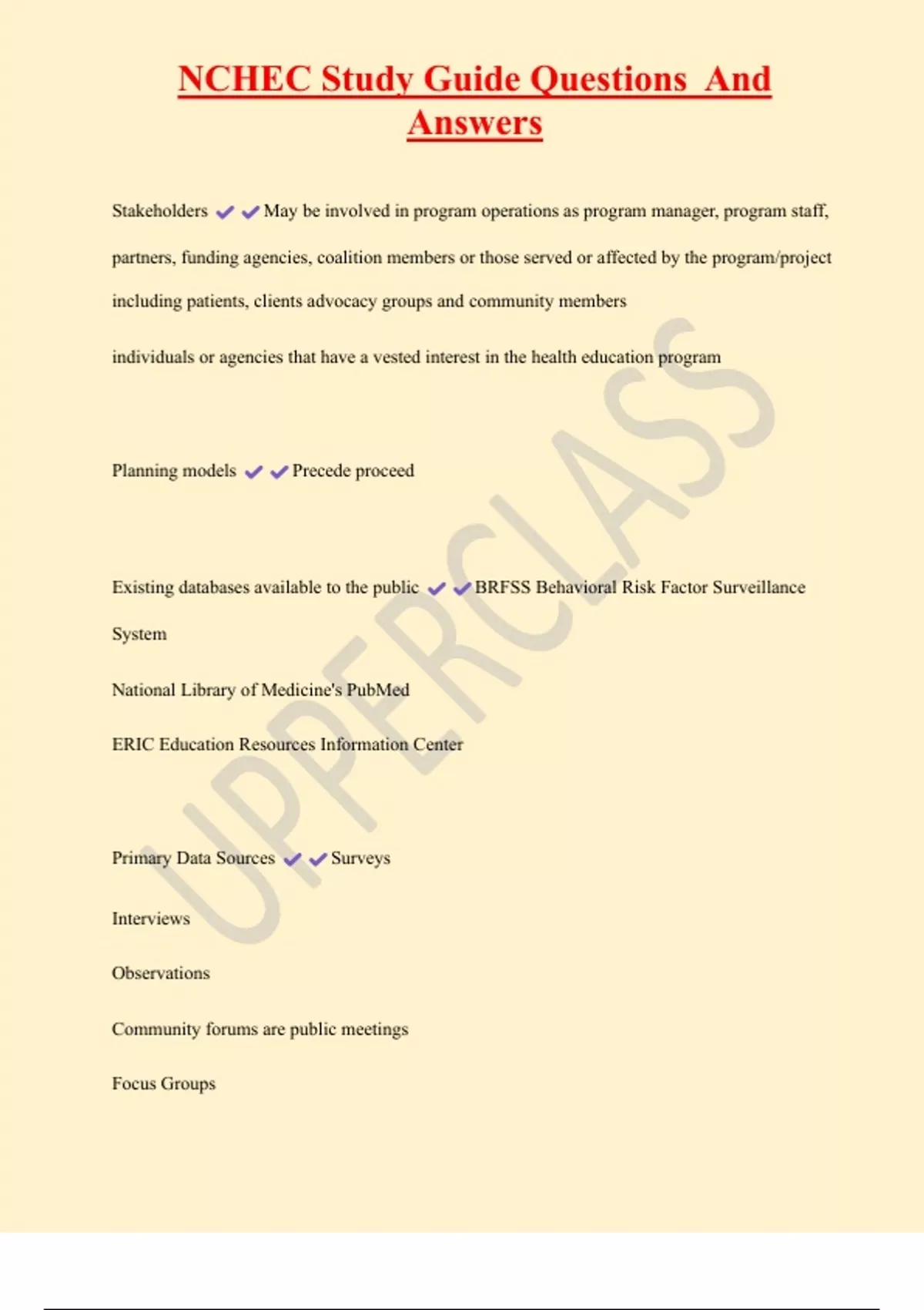 NCHEC Study Guide Questions And Answers Stakeholders May be involved in program operations as program manager, program staff, partners, funding agencies, coalition members or those served or affected by the program/project including patients, clients advocacy groups and community members individuals or agencies that have a vested interest in the health education program Planning models Precede proceed Existing databases available to the public BRFSS Behavioral Risk Factor Surveillance System National Library of Medicine's PubMed ERIC Education Resources Information Center