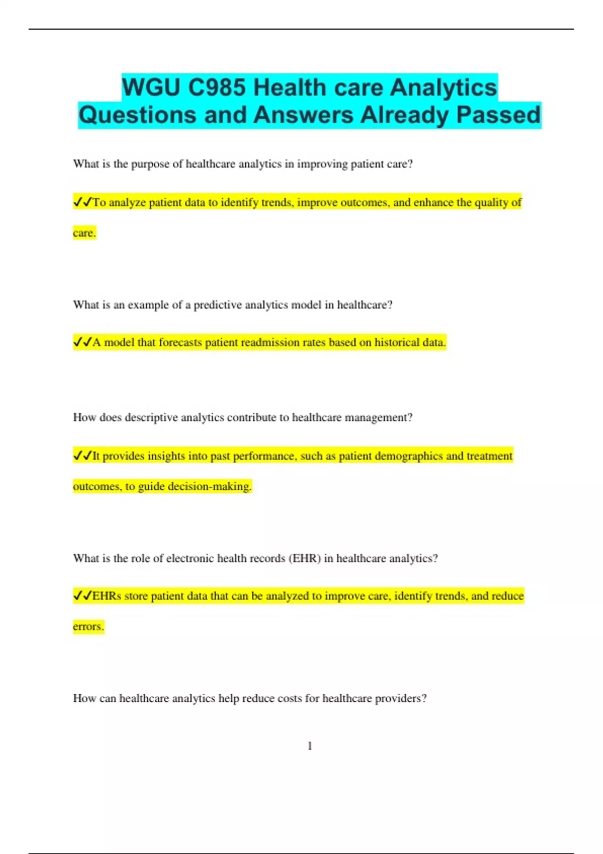 WGU C985 Health care Analytics Questions and Answers Already Passed What is the purpose of healthcare analytics in improving patient care? To analyze patient data to identify trends, improve outcomes, and enhance the quality of care. What is an example of a predictive analytics model in healthcare? A model that forecasts patient readmission rates based on historical data. How does descriptive analytics contribute to healthcare management? It provides insights into past performance, such as patient demographics and treatment outcomes, to guide decision-making. What is the role of electronic health records (EHR) in healthcare analytics? EHRs store patient data that can be analyzed to improve care, identify trends, and reduce errors. How can healthcare analytics help reduce costs for healthcare providers? 2 By identifying inefficiencies, reducing unnecessary tests or treatments, and improving resource allocation. What is the significance of clinical decision support systems (CDSS) in healthcare analytics? They provide healthcare professionals with data-driven insights to assist in making informed clinical decisions. How does data integration support healthcare analytics? It combines data from various sources, like EHRs, insurance claims, and lab results, to provide a comprehensive view of patient care. What type of data is essential for effective healthcare analytics? Patient demographics, clinical outcomes, billing data, and treatment plans. How can healthcare analytics contribute to improving patient satisfaction? By analyzing patient feedback and outcomes to identify areas for improvement in care delivery. What is the importance of data privacy and security in healthcare analytics? 3 It ensures that patient information is protected from unauthorized access, complying with regulations such as HIPAA. How does real-time data analytics improve healthcare outcomes? It allows healthcare providers to make timely decisions, reducing delays in treatment and improving patient care. What is an example of a prescriptive analytics application in healthcare? A system recommending personalized treatment plans based on patient history and data analysis. How does healthcare analytics impact population health management? It helps identify health trends within populations, enabling targeted interventions and resource allocation. What is the role of artificial intelligence (AI) in healthcare analytics? AI can analyze large datasets to uncover patterns and make predictions, enhancing diagnostic accuracy and treatment recommendations.