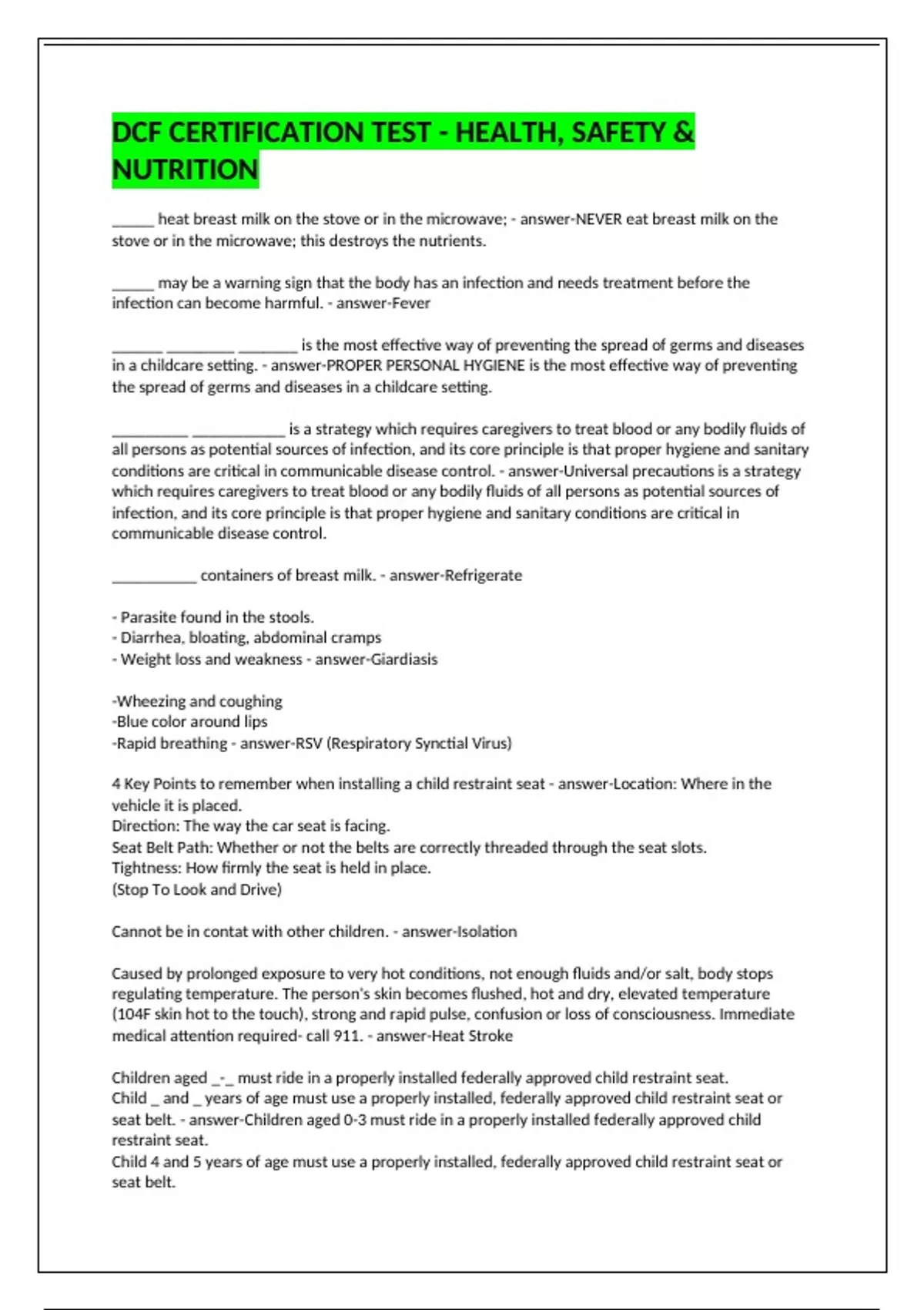 _____ heat breast milk on the stove or in the microwave; - answer-NEVER eat breast milk on the stove or in the microwave; this destroys the nutrients. _____ may be a warning sign that the body has an infection and needs treatment before the infection can become harmful. - answer-Fever ______ ________ _______ is the most effective way of preventing the spread of germs and diseases in a childcare setting. - answer-PROPER PERSONAL HYGIENE is the most effective way of preventing the spread of germs and diseases in a childcare setting. _________ ___________ is a strategy which requires caregivers to treat blood or any bodily fluids of all persons as potential sources of infection, and its core principle is that proper hygiene and sanitary conditions are critical in communicable disease control. - answer-Universal precautions is a strategy which requires caregivers to treat blood or any bodily fluids of all persons as potential sources of infection, and its core principle is that proper hygiene and sanitary conditions are critical in communicable disease control. __________ containers of breast milk. - answer-Refrigerate - Parasite found in the stools. - Diarrhea, bloating, abdominal cramps - Weight loss and weakness - answer-Giardiasis -Wheezing and coughing -Blue color around lips -Rapid breathing - answer-RSV (Respiratory Synctial Virus) 4 Key Points to remember when installing a child restraint seat - answer-Location: Where in the vehicle it is placed. Direction: The way the car seat is facing. Seat Belt Path: Whether or not the belts are correctly threaded through the seat slots. Tightness: How firmly the seat is held in place. (Stop To Look and Drive) Cannot be in contat with other children. - answer-Isolation Caused by prolonged exposure to very hot conditions, not enough fluids and/or salt, body stops regulating temperature. The person's skin becomes flushed, hot and dry, elevated temperature (104F skin hot to the touch), strong and rapid pulse, confusion or loss of consciousness. Immediate medical attention required- call 911. - answer-Heat Stroke Children aged _-_ must ride in a properly installed federally approved child restraint seat. Child _ and _ years of age must use a properly installed, federally approved child restraint seat or seat belt. - answer-Children aged 0-3 must ride in a properly installed federally approved child restraint seat. Child 4 and 5 years of age must use a properly installed, federally approved child restraint seat or seat belt. Correct Storage and Cooking Temperatures: Keep cold foods cold ( __ degrees or below) and hot foods hot (cook and hold at about ___ degrees) - answer-Keep cold foods cold ( 40 degrees or below) and hot foods hot (cook and hold at about 140 d