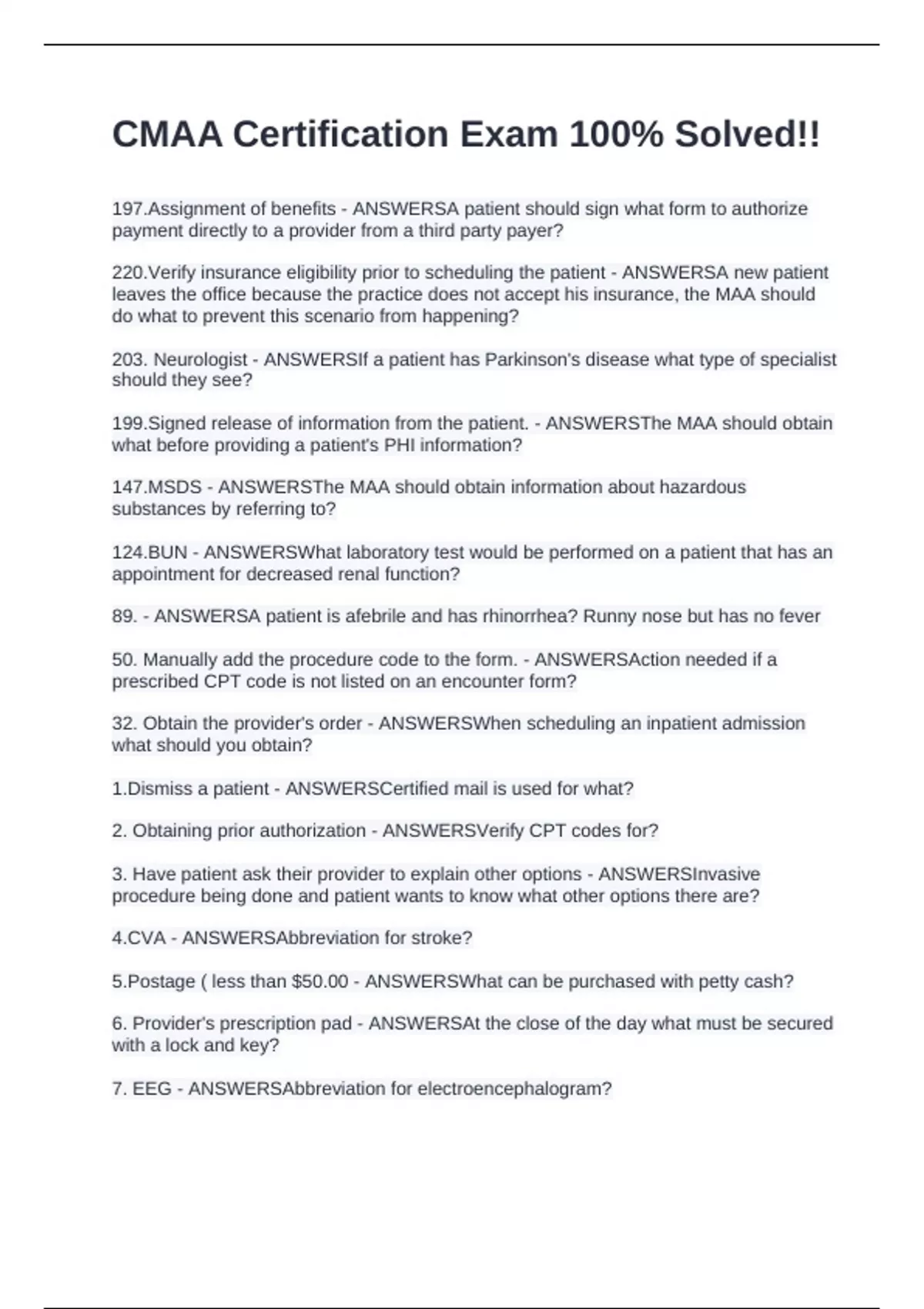 z197.Assignment of benefits - ANSWERSA patient should sign what form to authorize payment directly to a provider from a third party payer? 220.Verify insurance eligibility prior to scheduling the patient - ANSWERSA new patient leaves the office because the practice does not accept his insurance, the MAA should do what to prevent this scenario from happening? 203. Neurologist - ANSWERSIf a patient has Parkinson's disease what type of specialist should they see? 199.Signed release of information from the patient. - ANSWERSThe MAA should obtain what before providing a patient's PHI information? 147.MSDS - ANSWERSThe MAA should obtain information about hazardous substances by referring to? 124.BUN - ANSWERSWhat laboratory test would be performed on a patient that has an appointment for decreased renal function? 89. - ANSWERSA patient is afebrile and has rhinorrhea? Runny nose but has no fever 50. Manually add the procedure code to the form. - ANSWERSAction needed if a prescribed CPT code is not listed on an encounter form? 32. Obtain the provider's order - ANSWERSWhen scheduling an inpatient admission what should you obtain? 1.Dismiss a patient - ANSWERSCertified mail is used for what? 2. Obtaining prior authorization - ANSWERSVerify CPT codes for? 3. Have patient ask their provider to explain other options - ANSWERSInvasive procedure being done and patient wants to know what other options there are? 4.CVA - ANSWERSAbbreviation for stroke? 5.