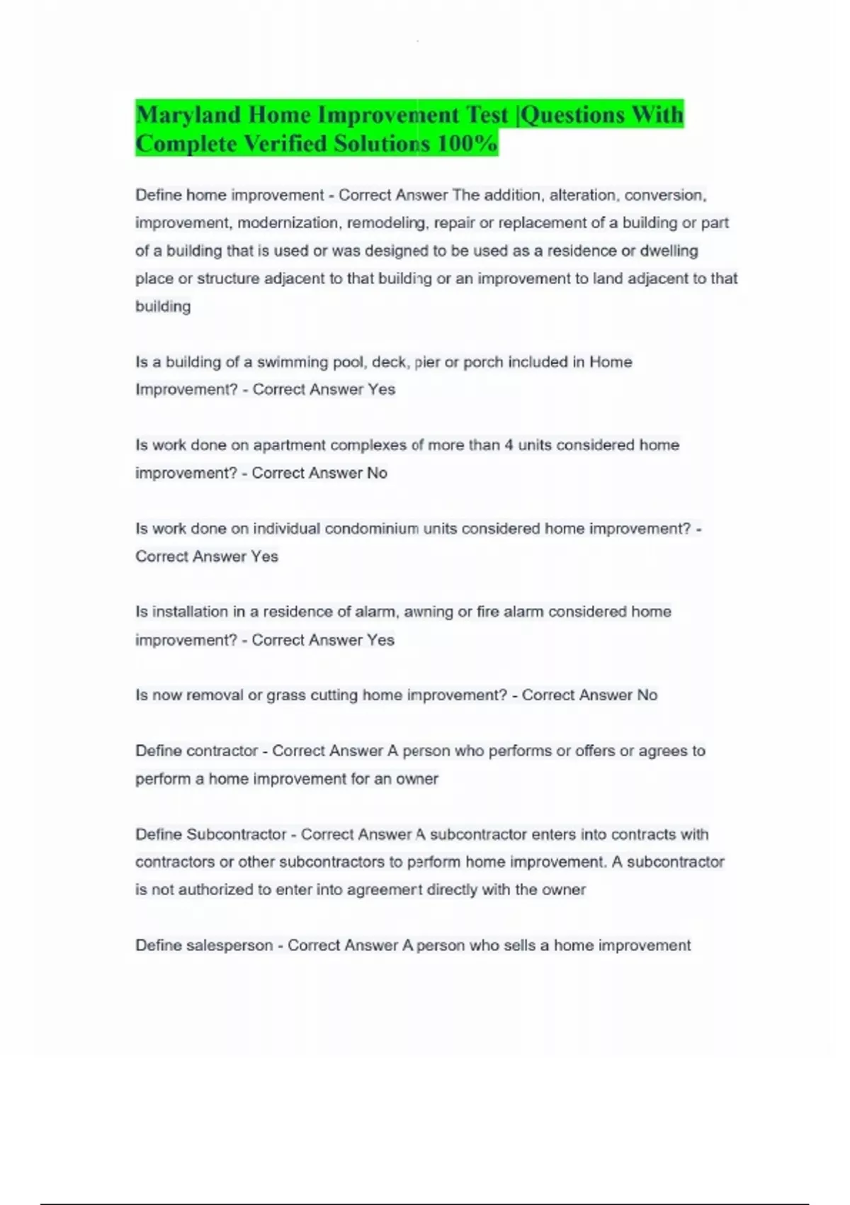 Maryland Home Improvement Test |Questions With Complete Verified Solutions 100% Define home improvement - Correct Answer The addition, alteration, conversion, improvement, modernization, remodeling, repair or replacement of a building or part of a building that is used or was designed to be used as a residence or dwelling place or structure adjacent to that building or an improvement to land adjacent to that building Is a building of a swimming pool, deck, pier or porch included in Home Improvement? - Correct Answer Yes Is work done on apartment complexes of more than 4 units considered home improvement? - Correct Answer No Is work done on individual condominium units considered home improvement? - Correct Answer Yes Is installation in a residence of alarm, awning or fire alarm considered home improvement? - Correct Answer Yes Is now removal or grass cutting home improvement? - Correct Answer No Define contractor - Correct Answer A person who performs or offers or agrees to perform a home improvement for an owner Define Subcontractor - Correct Answer A subcontractor enters into contracts with contractors or other subcontractors to perform home improvement. A subcontractor is not authorized to enter into agreement directly with the owner Define salesperson - Correct Answer A person who sells a home improvement