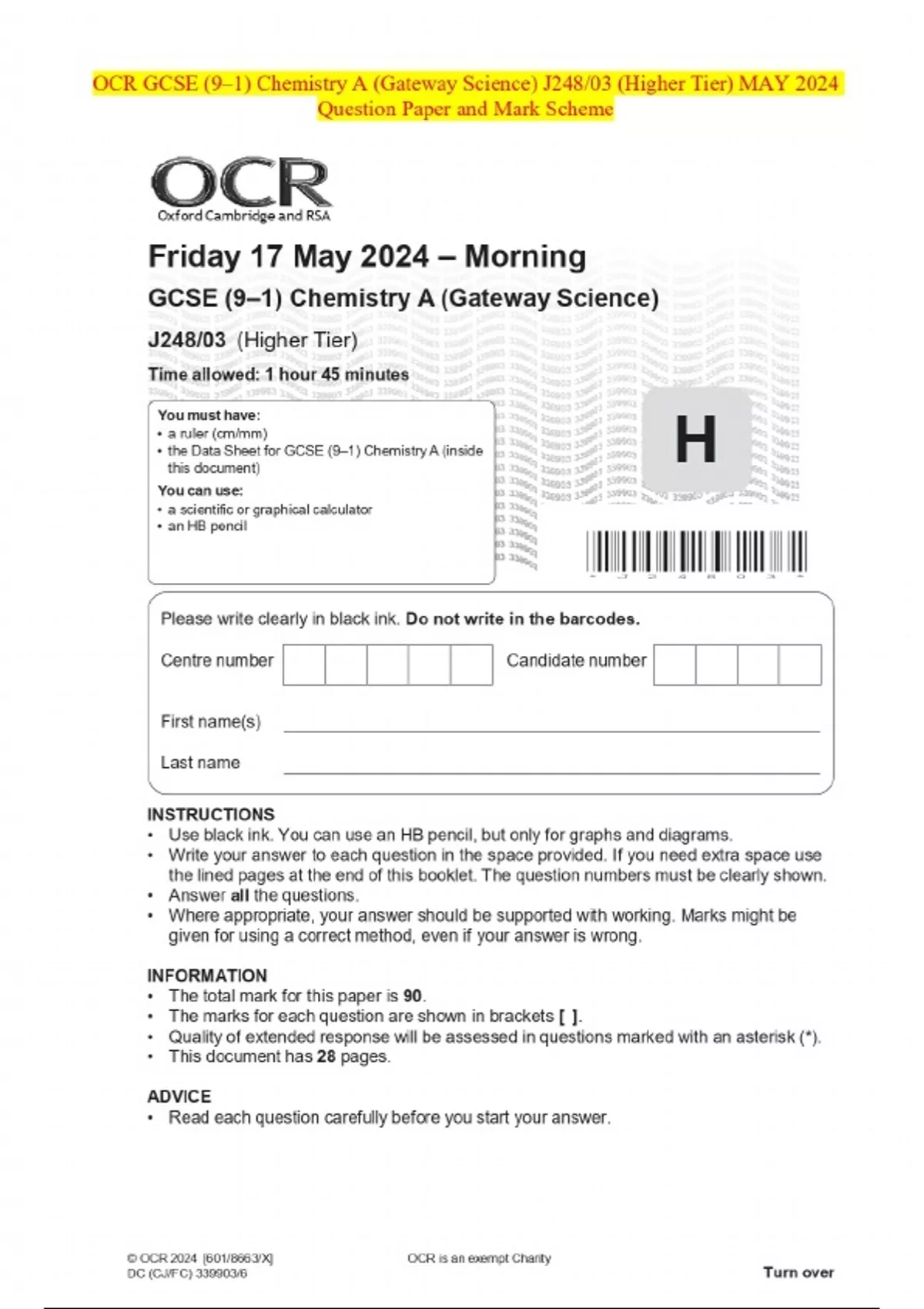 OCR GCSE (9–1) Chemistry A (Gateway Science) J248/03 (Higher Tier) MAY 2024 Question Paper and Mark Scheme