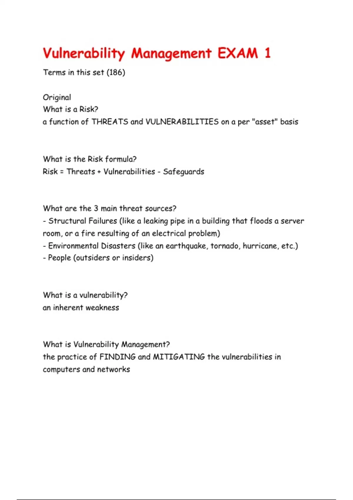 Risk = Threats + Vulnerabilities - Safeguards