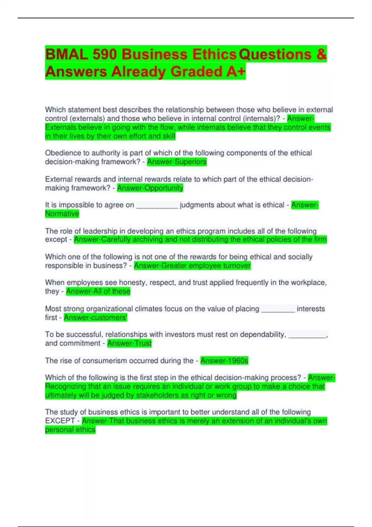 BMAL 590 Business Ethics Questions & Answers Already Graded A+