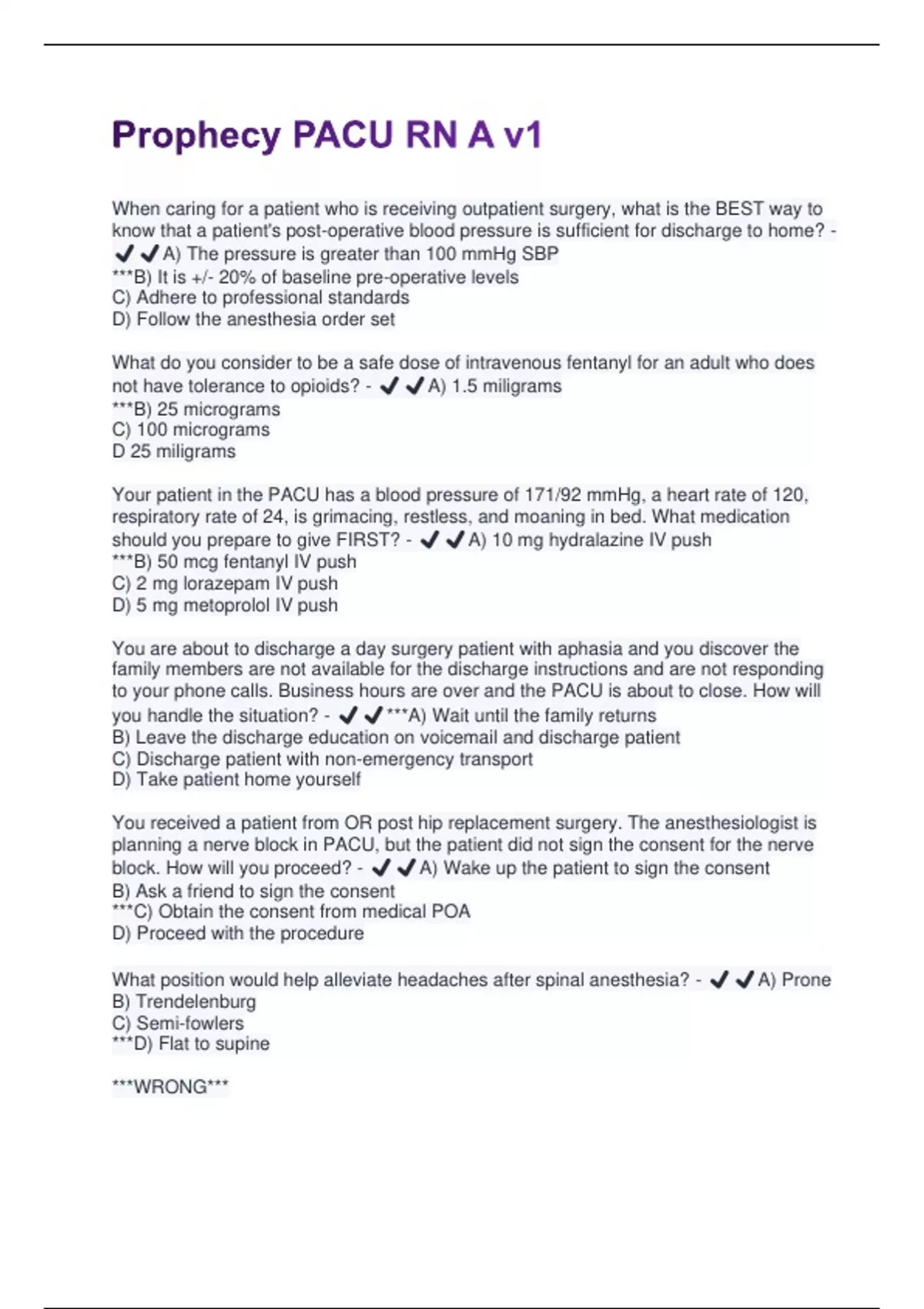 When caring for a patient who is receiving outpatient surgery, what is the BEST way to know that a patient's post-operative blood pressure is sufficient for discharge to home? - ️️A) The pressure is greater than 100 mmHg SBP ***B) It is +/- 20% of baseline pre-operative levels C) Adhere to professional standards D) Follow the anesthesia order set What do you consider to be a safe dose of intravenous fentanyl for an adult who does not have tolerance to opioids? - ️️A) 1.5 miligrams ***B) 25 micrograms C) 100 micrograms D 25 miligrams Your patient in the PACU has a blood pressure of 171/92 mmHg, a heart rate of 120, respiratory rate of 24, is grimacing, restless, and moaning in bed. What medication should you prepare to give FIRST? - ️️A) 10 mg hydralazine IV push ***B) 50 mcg fentanyl IV push C) 2 mg lorazepam IV push D) 5 mg metoprolol IV push You are about to discharge a day surgery patient with aphasia and you discover the family members are not available for the discharge instructions and are not responding to your phone calls. Business hours are over and the PACU is about to close. How will you handle the situation? - ️️***A) Wait until the family returns B) Leave the discharge education on voicemail and discharge patient C) Discharge patient with non-emergency transport D) Take patient home yourself You received a patient from OR post hip replacement surgery. The anesthesiologist is planning a nerve block in PACU, but the patient did not sign the consent for the nerve block. How will you proceed? - ️️A) Wake up the patient to sign the consent B) Ask a friend to sign the consent ***C) Obtain the consent from medical POA D) Proceed with the procedure What position would help alleviate headaches after spinal anesthesia? - ️️A) Prone B) Trendelenburg C) Semi-fowlers ***D) Flat to supine ***WRONG***What is a physical manifestation of neuromuscular blockade (Roc, succinylcholine)? - ️️A) Decreased consciousness B) Decreased pupillary light reflex C) Decreased respiratory effort ***WRONG***D) Decreased sensation of pain