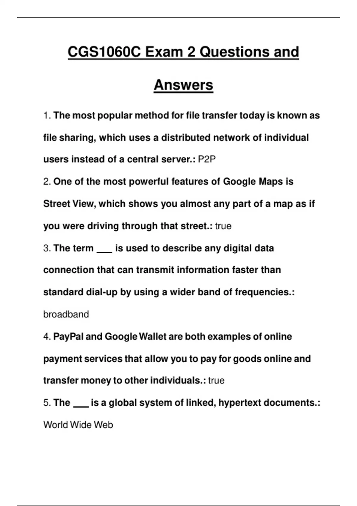 CGS1060C Exam 2 Questions and Answers 2024 1. The most popular method for file transfer today is known as file sharing, which uses a distributed network of individual users instead of a central server.: P2P 2. One of the most powerful features of Google Maps is Street View, which shows you almost any part of a map as if you were driving through that street.: true 3. The term is used to describe any digital data connection that can transmit information faster than standard dial-up by using a wider band of frequencies.: broadband 4. PayPal and Google Wallet are both examples of online payment services that allow you to pay for goods online and transfer money to other individuals.: true 5. The is a global system of linked, hypertext documents.: World Wide Web