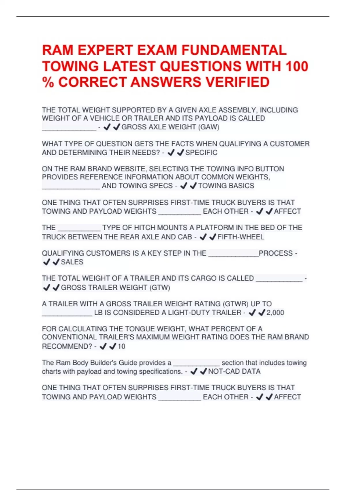 THE TOTAL WEIGHT SUPPORTED BY A GIVEN AXLE ASSEMBLY, INCLUDING WEIGHT OF A VEHICLE OR TRAILER AND ITS PAYLOAD IS CALLED ______________ - ️️GROSS AXLE WEIGHT (GAW) WHAT TYPE OF QUESTION GETS THE FACTS WHEN QUALIFYING A CUSTOMER AND DETERMINING THEIR NEEDS? - ️️SPECIFIC ON THE RAM BRAND WEBSITE, SELECTING THE TOWING INFO BUTTON PROVIDES REFERENCE INFORMATION ABOUT COMMON WEIGHTS, _______________ AND TOWING SPECS - ️️TOWING BASICS ONE THING THAT OFTEN SURPRISES FIRST-TIME TRUCK BUYERS IS THAT TOWING AND PAYLOAD WEIGHTS ___________ EACH OTHER - ️️AFFECT THE ___________ TYPE OF HITCH MOUNTS A PLATFORM IN THE BED OF THE TRUCK BETWEEN THE REAR AXLE AND CAB - ️️FIFTH-WHEEL QUALIFYING CUSTOMERS IS A KEY STEP IN THE _____________PROCESS - ️️SALES THE TOTAL WEIGHT OF A TRAILER AND ITS CARGO IS CALLED ____________ - ️️GROSS TRAILER WEIGHT (GTW) A TRAILER WITH A GROSS TRAILER WEIGHT RATING (GTWR) UP TO _____________ LB IS CONSIDERED A LIGHT-DUTY TRAILER - ️️2,000 FOR CALCULATING THE TONGUE WEIGHT, WHAT PERCENT OF A CONVENTIONAL TRAILER'S MAXIMUM WEIGHT RATING DOES THE RAM BRAND RECOMMEND? - ️️10 The Ram Body Builder's Guide provides a ____________ section that includes towing charts with payload and towing specifications. - ️️NOT-CAD DATA ONE THING THAT OFTEN SURPRISES FIRST-TIME TRUCK BUYERS IS THAT TOWING AND PAYLOAD WEIGHTS ___________ EACH OTHER - ️️AFFECTTHE ___________ TYPE OF HITCH MOUNTS A PLATFORM IN THE BED OF THE TRUCK BETWEEN THE REAR AXLE AND CAB - ️️FIFTH-WHEEL THE TOTAL WEIGHT SUPPORTED BY A GIVEN AXLE ASSEMBLY, INCLUDING WEIGHT OF A VEHICLE OR TRAILER AND ITS PAYLOAD IS CALLED ______________ - ️️GROSS AXLE WEIGHT (GAW)