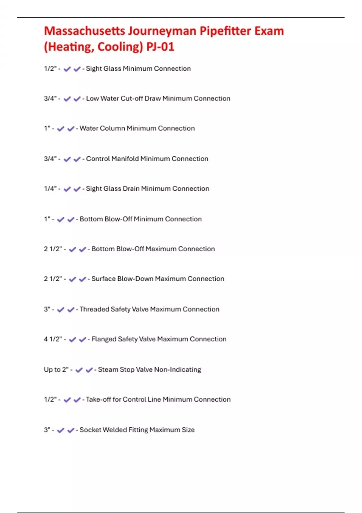 Massachusetts Journeyman Pipefitter Exam (Heating, Cooling) PJ-01 1/2" - - Sight Glass Minimum Connection 3/4" - - Low Water Cut-off Draw Minimum Connection 1" - - Water Column Mi