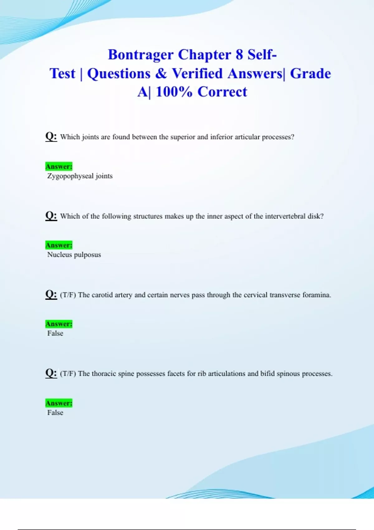 Bontrager Chapter 8 Self-Test | Questions & Verified Answers| Grade A| 100% Correct Q: Which joints are found between the superior and inferior articular processes? Answer: Zygopophyseal joints Q: Which of the following structures makes up the inner aspect of the intervertebral disk? Answer: Nucleus pulposus Q: (T/F) The carotid artery and certain nerves pass through the cervical transverse foramina. Answer: False Q: (T/F) The thoracic spine possesses facets for rib articulations and bifid spinous processes. Answer: False Q: The intervertebral foramina of the cervical spine lie at a _____________________ degree angle to the midsagittal plane. Answer: 45 Q: Which ligament holds the dens against the anterior arch of C1? Answer: Transverse atlantal ligament Q: The large joint space between C1 & C2 is called the _____. Answer: atlantoaxial joint Q: The two partial facets found on the thoracic vertebrae are called? Answer: Demifacets Q: Which thoracic vertebrae do NOT possess a facet for the costotransverse joint? Answer: T11 & T12 Q: Name 3 distinctive features of the cervical vertebrae.