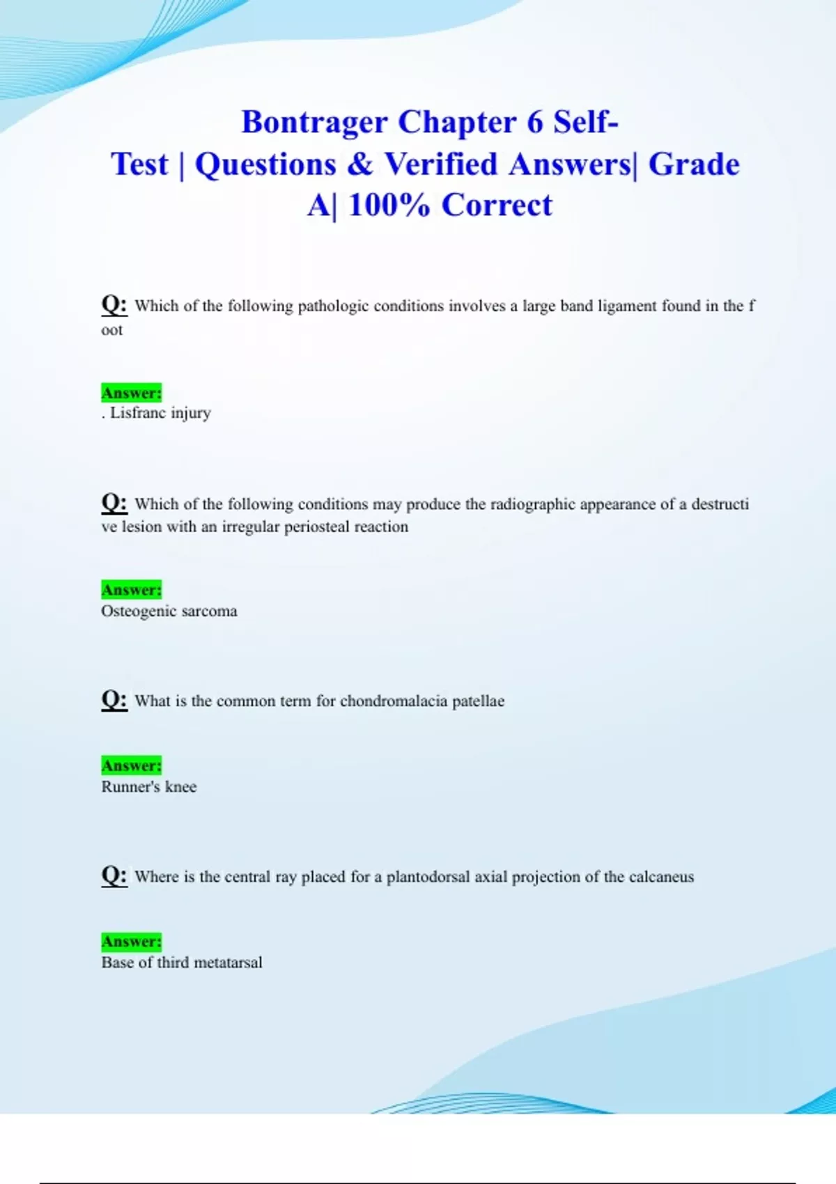 Bontrager Chapter 6 Self-Test | Questions & Verified Answers| Grade A| 100% Correct Q: Which of the following pathologic conditions involves a large band ligament found in the foot Answer: . Lisfranc injury Q: Which of the following conditions may produce the radiographic appearance of a destructive lesion with an irregular periosteal reaction Answer: Osteogenic sarcoma Q: What is the common term for chondromalacia patellae Answer: Runner's knee Q: Where is the central ray placed for a plantodorsal axial projection of the calcaneus Answer: Base of third metatarsal Q: Which ankle projection is best for demonstrating the mortise of the ankle Answer: AP oblique (15 to 20 medial rotation) Q: Which imaginary plane should be placed parallel to the IR for an AP projection of the knee Answer: . Interepicondylar Q: Which joint space should be open or almost open for a well-positioned AP oblique knee projection with medial rotation Answer: Proximal tibiofibular Q: True/False: A 5- to 7-degree cephalad angle of the central ray for a lateral projection of the knee helps superimpose the distal borders of the medial and lateral condyles of the femur when the lower leg has not been supported. Answer: True Q: Why is a PA projection of the patella preferred to an AP projection Answer: A. Less object image receptor distance (OID) B. Less distortion of patella