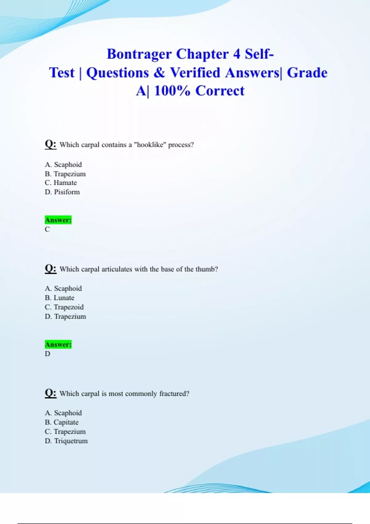 Bontrager Chapter 4 Self-Test | Questions & Verified Answers| Grade A| 100% Correct Q: Which carpal contains a "hooklike" process? A. Scaphoid B. Trapezium C. Hamate D. Pisiform Answer: C Q: Which carpal articulates with the base of the thumb? A. Scaphoid B. Lunate C. Trapezoid D. Trapezium Answer: D Q: Which carpal is most commonly fractured? A. Scaphoid B. Capitate C. Trapezium D. Triquetrum Answer: A Q: Which two carpal bones are located most anteriorly as seen on a lateral wrist radiograph? (Hint: They are on the radial side of the wrist.) A. Hamate and pisiform B. Trapezium and trapezoid C. Capitate and lunate D. Scaphoid and trapezium Answer: D Q: Which bone of the upper limb contains the coronoid process? A. Humerus B. First metacarpal C. Radius D. Ulna Answer: A Q: Where are the coronoid and radial fossae located? A. Anterior aspect of distal humerus B. Posterior aspect of distal humerus C. Proximal radius and ulna D. Distal end of radius Answer: A Q: Which two bony landmarks are palpated to assist with positioning of the upper limb? A. Coronoid and olecranon processes B. Pisiform and hamate C. Lateral and medial epicondyles D. Radial and ulnar styloid processes Answer: C Q: Where is the coronoid tubercle located? A. Medial aspect of coronoid process B. Anterior aspect of distal humerus C. Lateral aspect of proximal radius D. Posterior aspect of distal humerus Answer: A Q: In an erect anatomic position, which of the following structures is considered most inferior or distal? A. Head of ulna B. Olecranon process C. Radial tuberosity D. Head of radius Answer: B