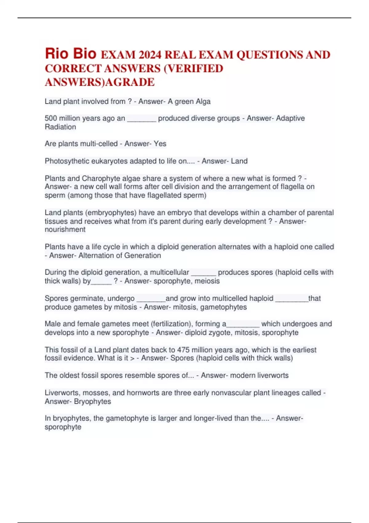 Rio Bio EXAM 2024 REAL EXAM QUESTIONS AND CORRECT ANSWERS (VERIFIED ANSWERS)AGRADE Land plant involved from ? - Answer- A green Alga 500 million years ago an _______ produced diverse groups - Answer- Adaptive Radiation Are plants multi-celled - Answer- Yes Photosythetic eukaryotes adapted to life on.... - Answer- Land Plants and Charophyte algae share a system of where a new what is formed ? - Answer- a new cell wall forms after cell division and the arrangement of flagella on sperm (among those that have flagellated sperm) Land plants (embryophytes) have an embryo that develops within a chamber of parental tissues and receives what from it's parent during early development ? - Answer- nourishment Plants have a life cycle in which a diploid generation alternates with a haploid one called - Answer- Alternation of Generation During the diploid generation, a multicellular ______ produces spores (haploid cells with thick walls) by_____ ? - Answer- sporophyte, meiosis Spores germinate, undergo _______and grow into multicelled haploid ________that produce gametes by mitosis - Answer- mitosis, gametophytes Male and female gametes meet (fertilization), forming a________ which undergoes and develops into a new sporophyte - Answer- diploid zygote, mitosis, sporophyte This fossil of a Land plant dates back to 475 million years ago, which is the earliest fossil evidence. What is it > - Answer- Spores (haploid cells with thick walls) The oldest fossil spores resemble spores of... - Answer- modern liverworts Liverworts, mosses, and hornworts are three early nonvascular plant lineages called - Answer- Bryophytes In bryophytes, the gametophyte is larger and longer-lived than the.... - Answer- sporophyte The first seedless vascular plants evolved about how many years ago ? - Answer- 430 million years ago In vascular plants, the_____ is larger and longer-lived than the______ and has specialized internal pipelines that transport_____ ? - Answer- sporophyte, gametophyte, water and sugars Seed plants evolved about _____ million years ago? - Answer- 385 What kind of plant are vascular plants ? - Answer- Seed plants are ______ that hold onto their spores and disperse by releasing seeds. Producing seeds and pollen allowed seed plants to expand into.... - Answer- dry habitats that seedless plants could not tolerate