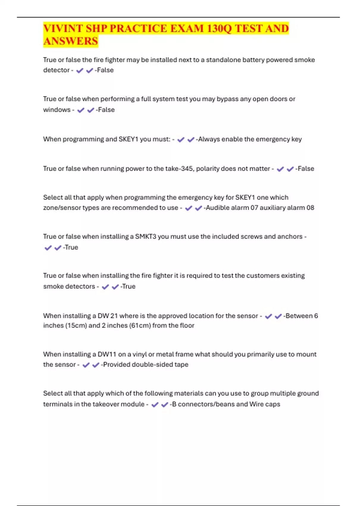 VIVINT SHP PRACTICE EXAM 130Q TEST AND ANSWERS True or false the fire fighter may be installed next to a standalone battery powered smoke detector - -False True or false when performing a full system test you may bypass any open doors or windows - -False When programming a
