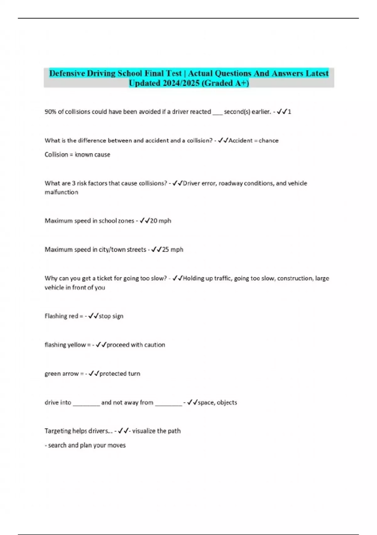 Defensive Driving School Final Test | Actual Questions And Answers Latest Updated 2024/2025 (Graded A+)