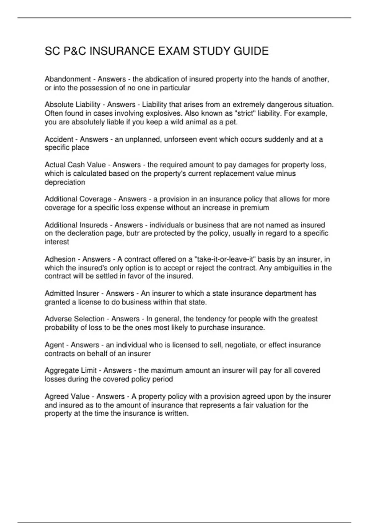 SC P&C INSURANCE EXAM STUDY GUIDE