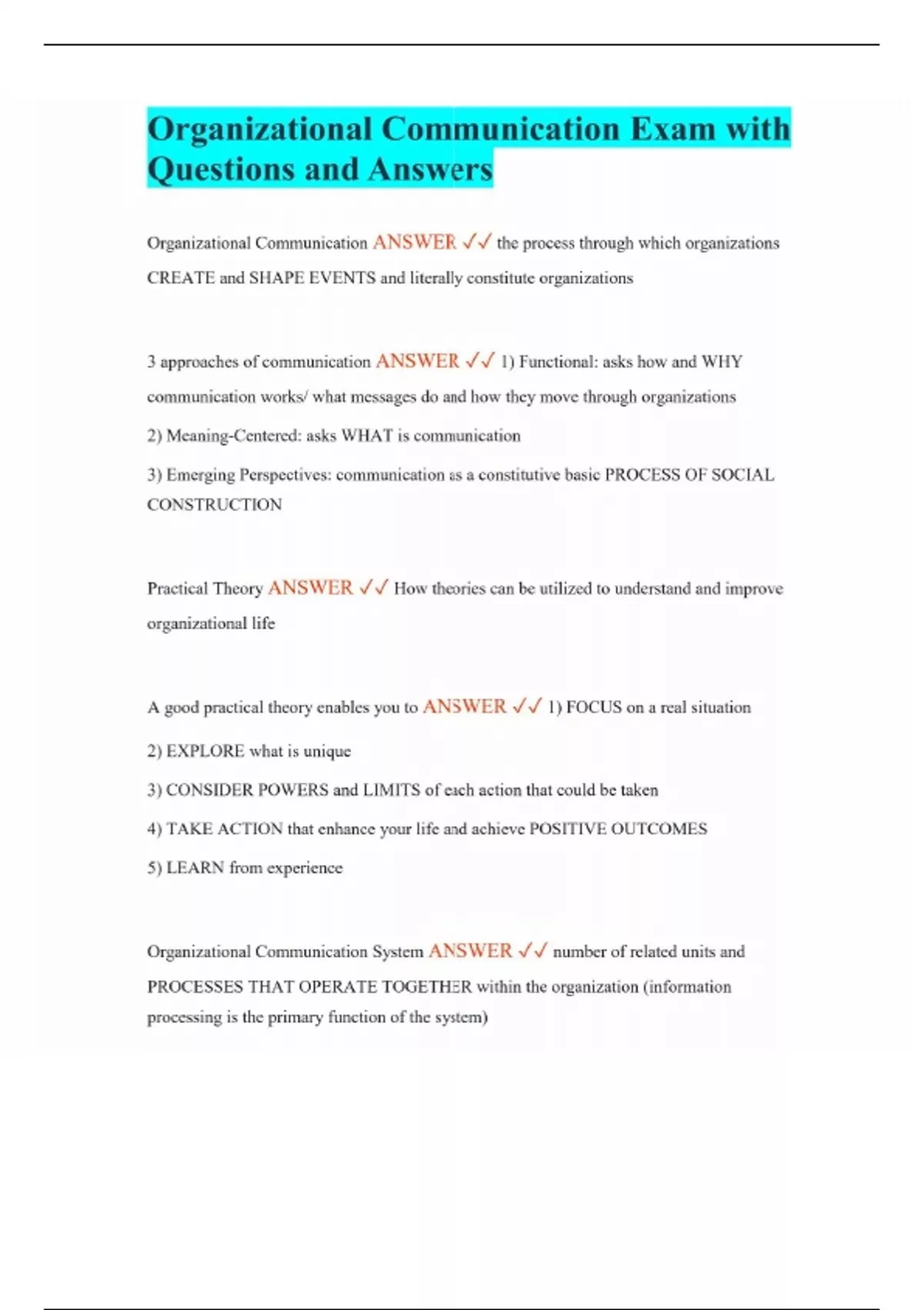Organizational Communication Exam with Questions and Answers Organizational Communication ANSWER the process through which organizations CREATE and SHAPE EVENTS and literally constitute organizations 3 approaches of communication ANSWER 1) Functional: asks how and WHY communication works/ what messages do and how they move through organizations 2) Meaning-Centered: asks WHAT is communication 3) Emerging Perspectives: communication as a constitutive basic PROCESS OF SOCIAL CONSTRUCTION Practical Theory ANSWER How theories can be utilized to understand and improve organizational life A good practical theory enables you to ANSWER 1) FOCUS on a real situation 2) EXPLORE what is unique 3) CONSIDER POWERS and LIMITS of each action that could be taken 4) TAKE ACTION that enhance your life and achieve POSITIVE OUTCOMES 5) LEARN from experience Organizational Communication System ANSWER number of related units and PROCESSES THAT OPERATE TOGETHER within the organization (information processing is the primary function of the system) Communication inputs ANSWER External information that may influence decision