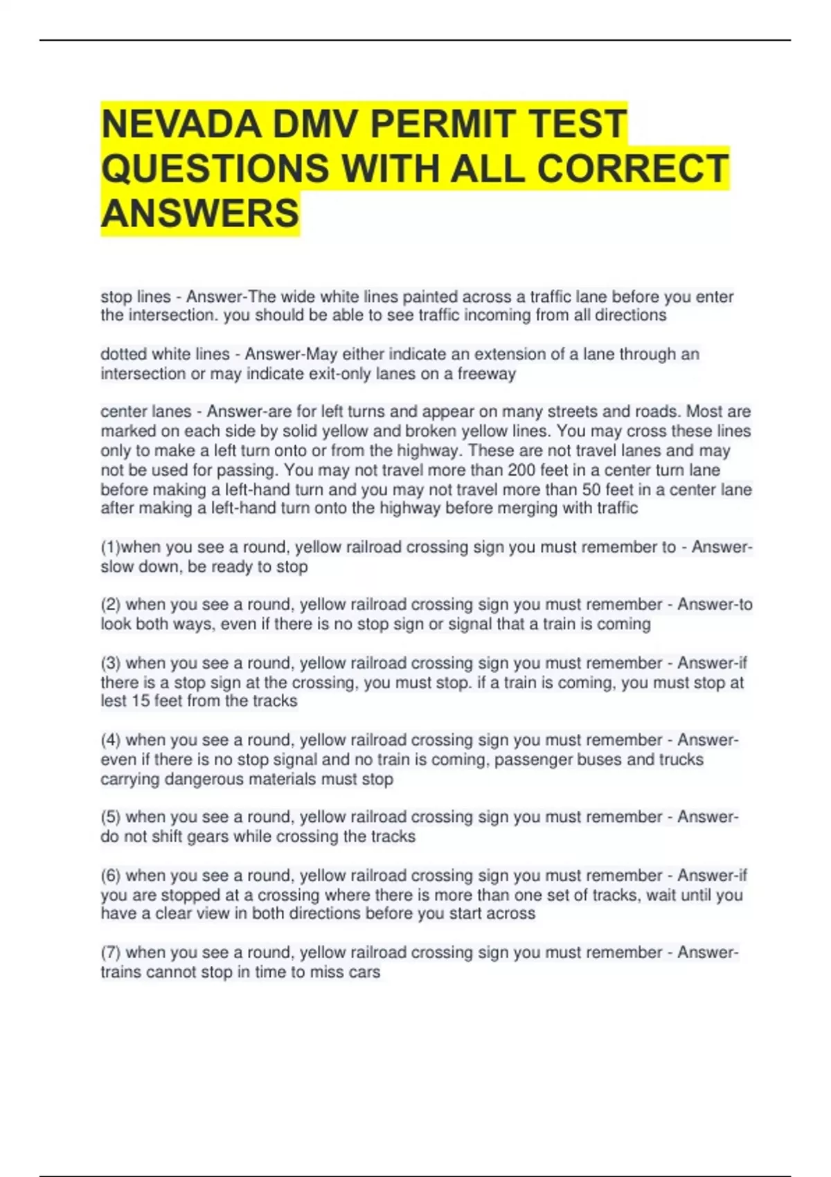 NEVADA DMV PERMIT TEST QUESTIONS WITH ALL CORRECT ANSWERS stop lines - Answer-The wide white lines painted across a traffic lane before you enter the intersection. you should be able to see traffic incoming from all directions dotted white lines - Answer-May either indicate an extension of a lane through an intersection or may indicate exit-only lanes on a freeway center lanes - Answer-are for left turns and appear on many streets and roads. Most are marked on each side by solid yellow and broken yellow lines. You may cross these lines only to make a left turn onto or from the highway. These are not travel lanes and may not be used for passing. You may not travel more than 200 feet in a center turn lane before making a left-hand turn and you may not travel more than 50 feet in a center lane after making a left-hand turn onto the highway before merging with traffic (1)when you see a round, yellow railroad crossing sign you must remember to - Answer-slow down, be ready to stop (2) when you see a round, yellow railroad crossing sign you must remember - Answer-to look both ways, even if there is no stop sign or signal that a train is coming (3) when you see a round, yellow railroad crossing sign you must remember - Answer-if there is a stop sign at the crossing, you must stop. if a train is coming, you must stop at lest 15 feet from the tracks (4) when you see a round, yellow railroad crossing sign you must remember - Answer-even if there is no stop signal and no train is coming, passenger buses and trucks carrying dangerous materials must stop (5) when you see a round, yellow railroad crossing sign you must remember - Answer-do not shift gears while crossing the tracks (6) when you see a round, yellow railroad crossing sign you must remember - Answer-if you are stopped at a crossing where there is more than one set of tracks, wait until you have a clear view in both directions before you start across (7) when you see a round, yellow railroad crossing sign you must remember - Answer-trains cannot stop in time to miss cars (8) when you see a round, yellow railroad crossing sign you must remember - Answer-it is difficult to accurately judge the speed of a moving train (9) when you see a round, yellow railroad crossing sign you must remember - Answer-if a gate is lowered, you may not proceed around it even if no train is visible (10) when you see a round, yellow railroad crossing sign you must remember - Answer-if the signal lights are flashing, you must stop. you may proceed of no train is visible or it is safe to cross (11) when you see a round, yellow railroad crossing sign you must remember - Answer-if you get stuck on tracks, leave your vehicle immediately and notify local law enforcement or railroad authorities (12) when you see a round, yellow railroad crossing sign you must remember - Answer-to never park your vehicle within 50 feet of the nearest rail of a railroad