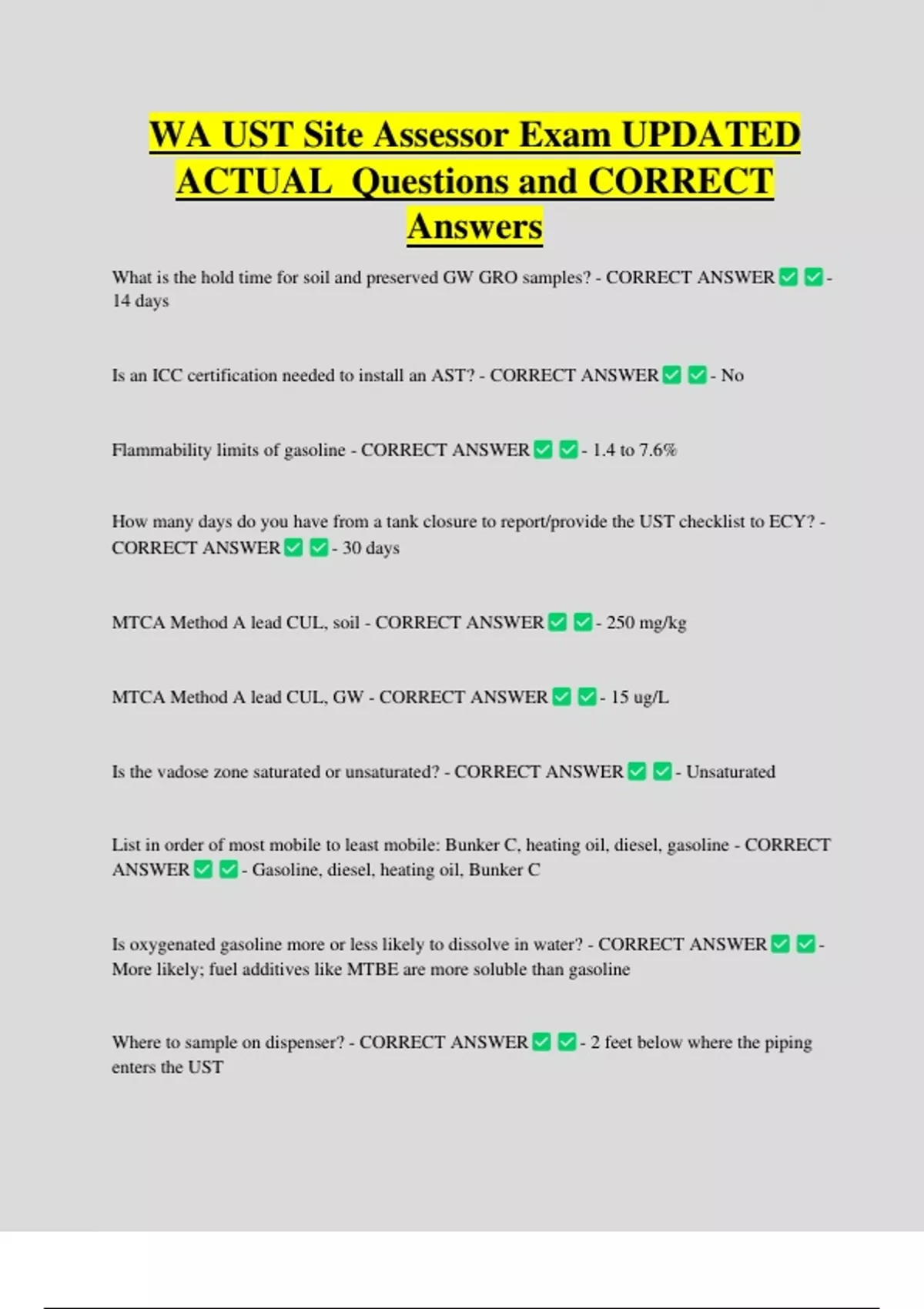WA UST Site Assessor Exam UPDATED ACTUAL Questions and CORRECT Answers What is the hold time for soil and preserved GW GRO samples? - CORRECT ANSWER - 14 days Is an ICC certification needed to install an AST? - CORRECT ANSWER - No Flammability limits of gasoline - CORRECT ANSWER - 1.4 to 7.6%