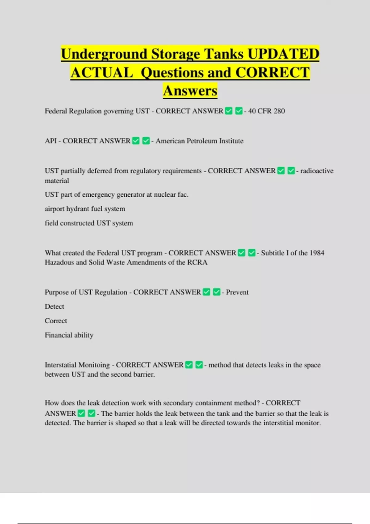 Underground Storage Tanks UPDATED ACTUAL Questions and CORRECT Answers Federal Regulation governing UST - CORRECT ANSWER - 40 CFR 280 API - CORRECT ANSWER - American Petroleum Institut