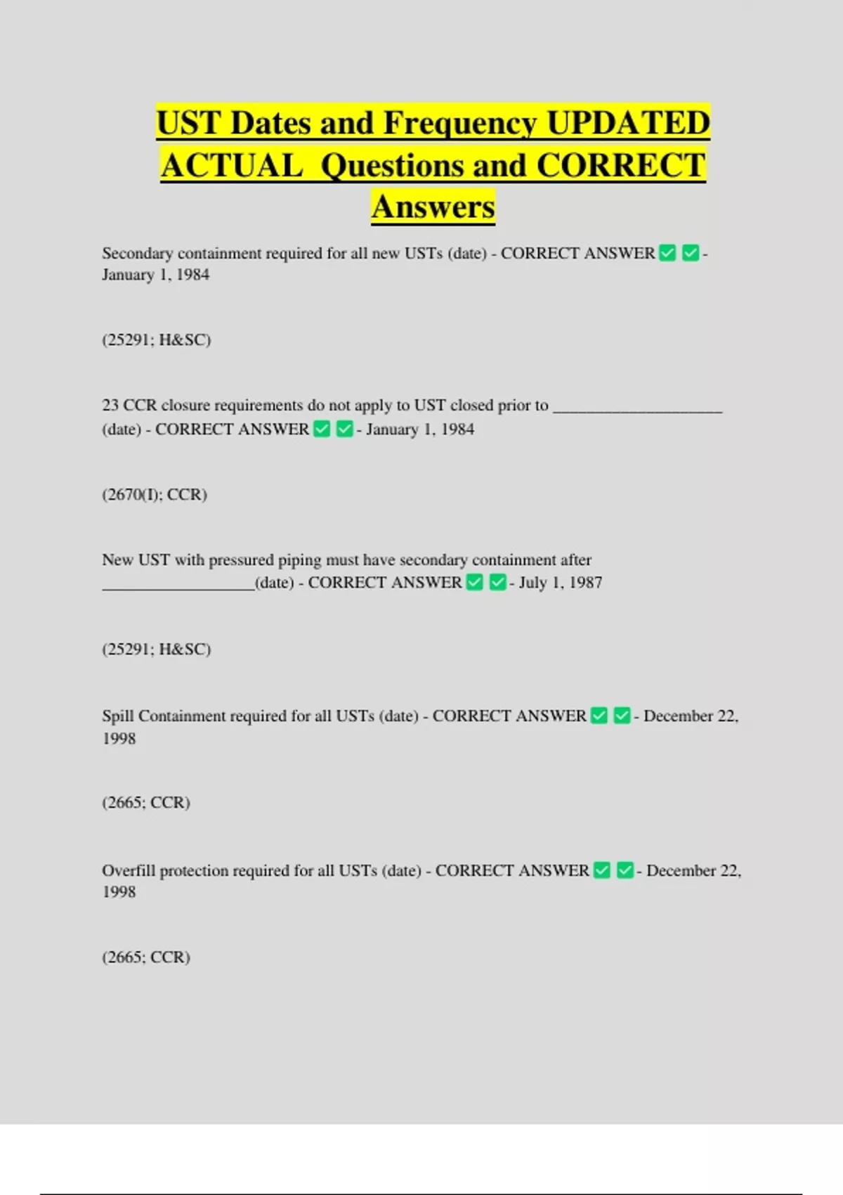 UST Dates and Frequency UPDATED ACTUAL Questions and CORRECT Answers Secondary containment required for all new USTs (date) - CORRECT ANSWER - January 1, 1984 (25291; H&SC) 23 CCR closure requirements do not apply to UST closed prior to ____________________ (date) - CORRECT ANSWER - January 1, 1984