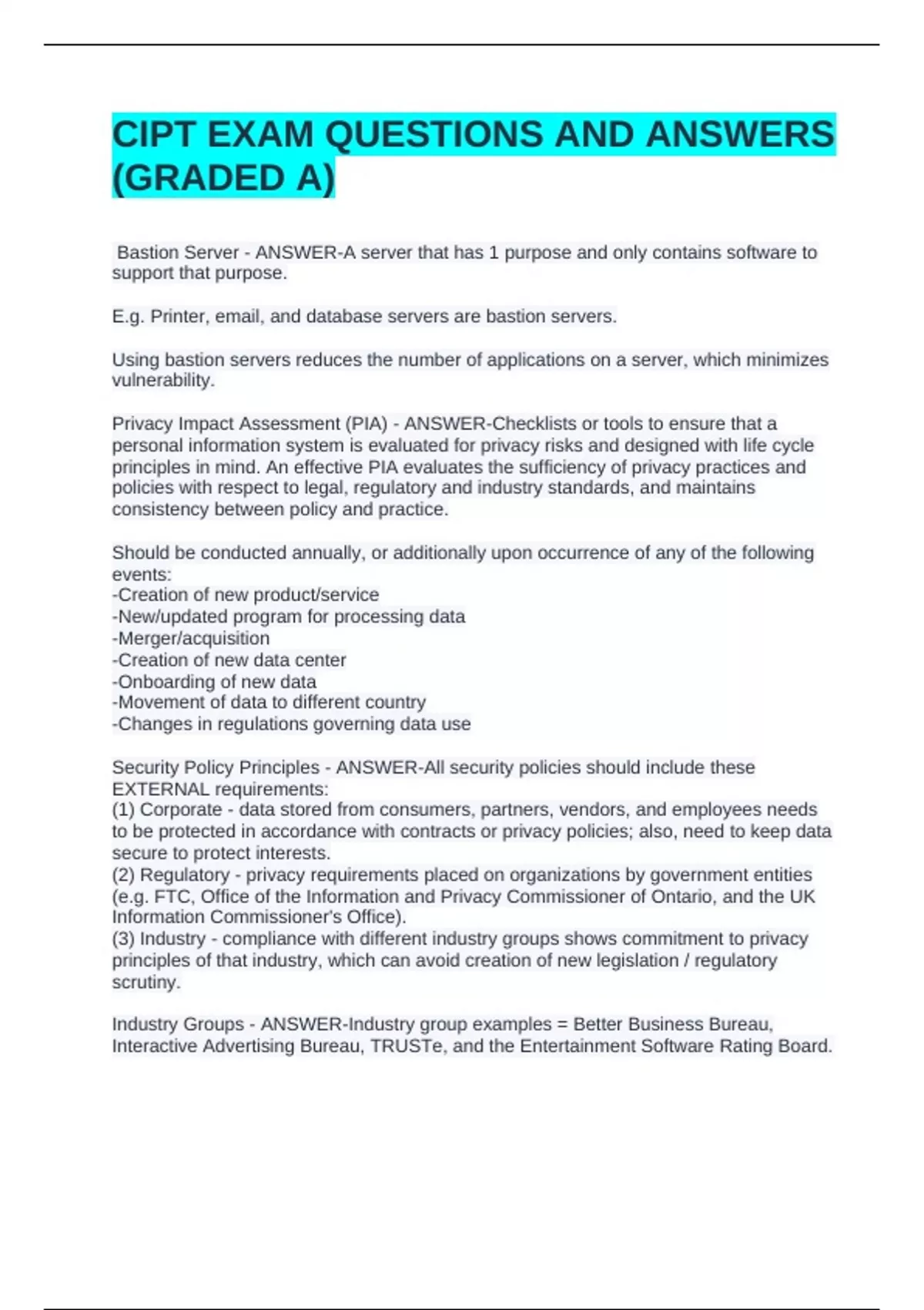 CIPT EXAM QUESTIONS AND ANSWERS (GRADED A)CIPT EXAM QUESTIONS AND ANSWERS (GRADED A)CIPT EXAM QUESTIONS AND ANSWERS (GRADED A)CIPT EXAM QUESTIONS AND ANSWERS (GRADED A) Bastion Server - ANSWER-A server that has 1 purpose and only contains software to support that purpose. E.g. Printer, email, and database servers are bastion servers. Using bastion servers reduces the number of applications on a server, which minimizes vulnerability. Privacy Impact Assessment (PIA) - ANSWER-Checklists or tools to ensure that a personal information system is evaluated for privacy risks and designed with life cycle principles in mind. An effective PIA evaluates the sufficiency of privacy practices and policies with respect to legal, regulatory and industry standards, and maintains consistency between policy and practice. Should be conducted annually, or additionally upon occurrence of any of the following events: