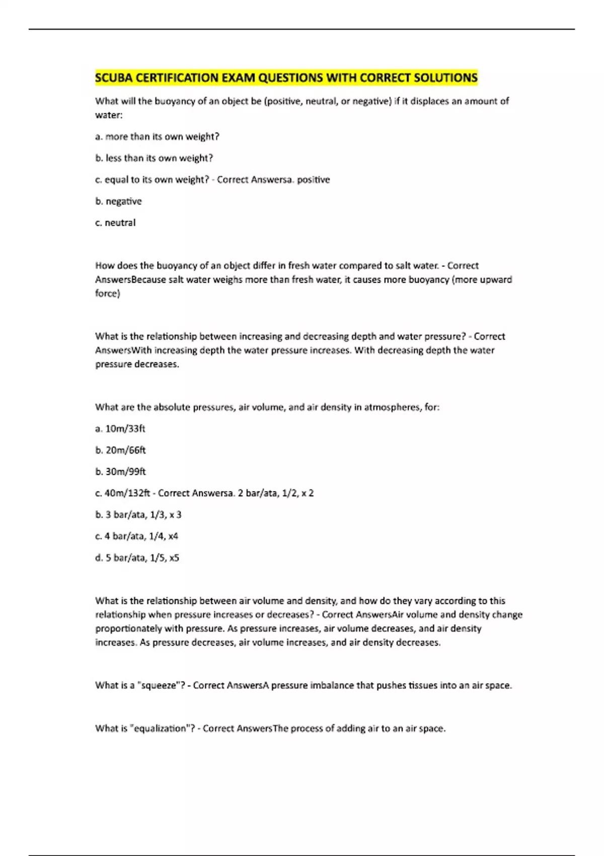 SCUBA CERTIFICATION EXAM QUESTIONS WITH CORRECT SOLUTIONS What will the buoyancy of an object be (positive, neutral, or negative) if it displaces an amount of water: a. more than its own weight? b. less than its own weight? c. equal to its own weight? - Correct Answersa. positive b. negative c. neutral How does the buoyancy of an object differ in fresh water compared to salt water. - Correct AnswersBecause salt water weighs more than fresh water, it causes more buoyancy (more upward force) What is the relationship between increasing and decreasing depth and water pressure? - Correct AnswersWith increasing depth the water pressure increases. With decreasing depth the water pressure decreases. What are the absolute pressures, air volume, and air density in atmospheres, for: a. 10m/33ft b. 20m/66ft b. 30m/99ft c. 40m/132ft - Correct Answersa. 2 bar/ata, 1/2, x 2 b. 3 bar/ata, 1/3, x 3 c. 4 bar/ata, 1/4, x4 d. 5 bar/ata, 1/5, x5 What is the relationship between air volume and density, and how do they vary according to this relationship when pressure increases or decreases? - Correct AnswersAir volume and density change proportionately with pressure. As pressure increases, air volume decreases, and air density increases. As pressure decreases, air volume increases, and air density decreases. What is a "squeeze"? - Correct AnswersA pressure imbalance that pushes tissues into an air space. What is "equalization"? - Correct AnswersThe process of adding air to an air space.