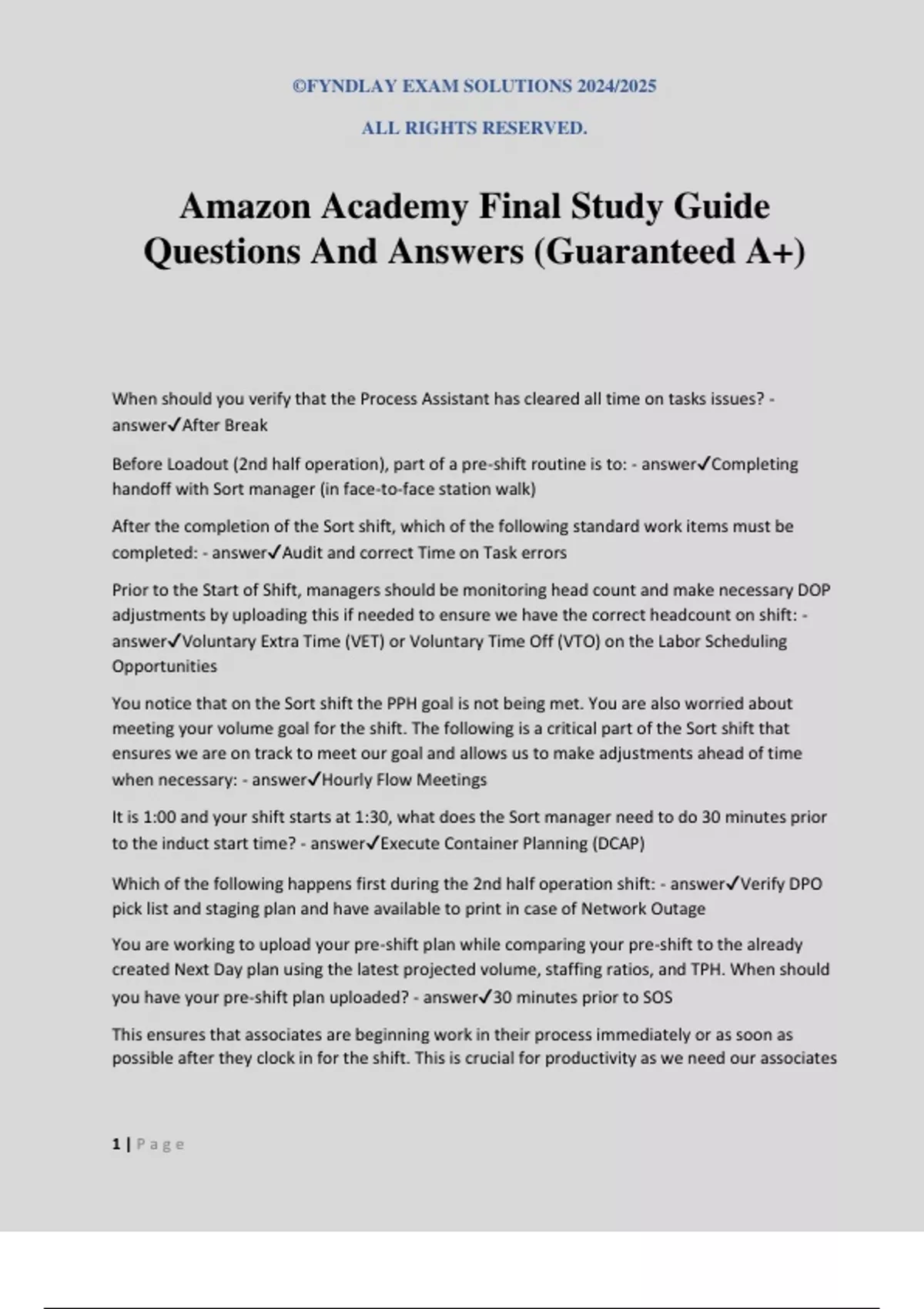 ©FYNDLAY EXAM SOLUTIONS 2024/2025 ALL RIGHTS RESERVED. 1 | P a g e Amazon Academy Final Study Guide Questions And Answers (Guaranteed A+) When should you verify that the Process Assistant has cleared all time on tasks issues? - answerAfter Break Before Loadout (2nd half operation), part of a pre-shift routine is to: - answerCompleting handoff with Sort manager (in face-to-face station walk) After the completion of the Sort shift, which of the following standard work items must be completed: - answerAudit and correct Time on Task errors Prior to the Start of Shift, managers should be monitoring head count and make necessary DOP adjustments by uploading this if needed to ensure we have the correct headcount on shift: - answerVoluntary Extra Time (VET) or Voluntary Time Off (VTO) on the Labor Scheduling Opportunities You notice that on the Sort shift the PPH goal is not being met. You are also worried about meeting your volume goal for the shift. The following is a critical part of the Sort shift that ensures we are on track to meet our goal and allows us to make adjustments ahead of time when necessary: - answerHourly Flow Meetings It is 1:00 and your shift starts at 1:30, what does the Sort manager need to do 30 minutes prior to the induct start time? - answerExecute Container Planning (DCAP) Which of the following happens first during the 2nd half operation shift: - answerVerify DPO pick list and staging plan and have available to print in case of Network Outage You are working to upload your pre-shift plan while comparing your pre-shift to the already created Next Day plan using the latest projected volume, staffing ratios, and TPH. When should you have your pre-shift plan uploaded? - answer30 minutes prior to SOS This ensures that associates are beginning work in their process immediately or as soon as possible after they clock in for the shift. This is crucial for productivity as we need our associates ©FYNDLAY EXAM SOLUTIONS 2024/2025 ALL RIGHTS RESERVED. 2 | P a g e to begin working as quickly as possible. Our current Network Goal is 2 minutes. - answerFast Start You are responsible for creating the Next Day plan. You finish completing the plan right towards the end of the current shift. Where should you go to upload your finalized Next Day plan? - answerSiphon You need 85 people to safely and efficiently process today's volume. You are currently rostered 97 people and average attendance for this day is 82%. How many associates do you need to accept VET in order to staff the shift? - answer6 Your Station has 225 DA's available per day with an SPR of 195 and an available Flex pool of 75 with an SPR of 40. What is your total dispatch capacity? - answer46,875 You are in charge of Pick & Stage and OTR depends on you for your staging of routes on time. How do you stay proactive to avoid OTD misses? - answerLabor planning properly based off of projected rates and volumes to ensure you have the correct headcount You need 73 people to safely and efficiently process today's volume. You are currently rostered 82 people and average attendance for this day is 82%. How many associates do you need to accept VET in order to staff the shift? - answer6 Your site is expecting a total volume of 57,544 packages today. DSPs have committed to delivery 92% of this, and the remaining 8% will go to the flex pool. Assuming all of the 150 drivers in the flex pool accept routes, at an SPR of 25 packages, how many shipments will not dispatch from the site? (round up to the nearest whole number) - answer854 You are performing your Pick Stage Area walk, what are visual indicators that your Picklist Compliance has misses? Select the two that applyEmpty Stow RacksPackages at the end of stow aislesPackages left in the end cap areasPick racks are full - answerNOT 1 and 3 Only What are key performance indicators that you should look at when choosing candidates for Critical Roles? - answerAll of the above What is the minimum requirement for having 1:1s with your direct manager logged in Ingenii? - answerMonthly Why was Apollo created? - answerApollo was created to be the Audit portal supporting planning, execution, result sharing and reporting of any type of audit, in all NA Delivery Stations. Which of these best describe the problem solve role on loadout? - answerAssociate that resolves partially picked routes, audits route for accuracy, and investigates staging or container