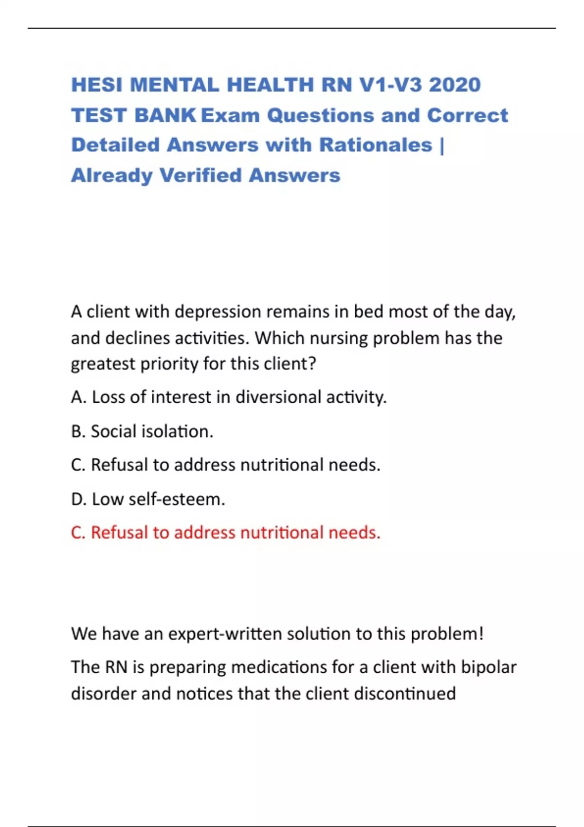 HESI MENTAL HEALTH RN V1-V3 2020 TEST BANK Exam Questions and Correct Detailed Answers with Rationales | Already Verified Answers