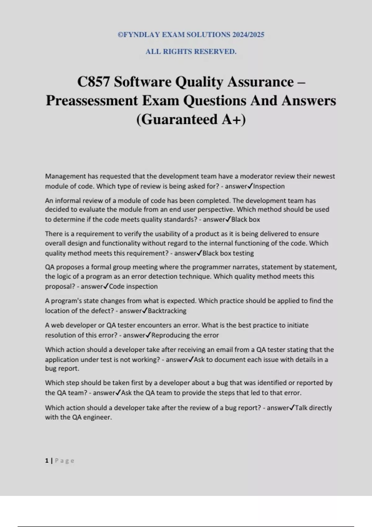 ©FYNDLAY EXAM SOLUTIONS 2024/2025 ALL RIGHTS RESERVED. 1 | P a g e C857 Software Quality Assurance – Preassessment Exam Questions And Answers (Guaranteed A+) Management has requested that the development team have a moderator review their newest module of code. Which type of review is being asked for? - answerInspection An informal review of a module of code has been completed. The development team has decided to evaluate the module from an end user perspective. Which method should be used to determine if the code meets quality standards? - answerBlack box There is a requirement to verify the usability of a product as it is being delivered to ensure overall design and functionality without regard to the internal functioning of the code. Which quality method meets this requirement? - answerBlack box testing QA proposes a formal group meeting where the programmer narrates, statement by statement, the logic of a program as an error detection technique. Which quality method meets this proposal? - answerCode inspection A program's state changes from what is expected. Which practice should be applied to find the location of the defect? - answerBacktracking A web developer or QA tester encounters an error. What is the best practice to initiate resolution of this error? - answerReproducing the error Which action should a developer take after receiving an email from a QA tester stating that the application under test is not working? - answerAsk to document each issue with details in a bug report. Which step should be taken first by a developer about a bug that was identified or reported by the QA team? - answerAsk the QA team to provide the steps that led to that error. Which action should a developer take after the review of a bug report? - answerTalk directly with the QA engineer.