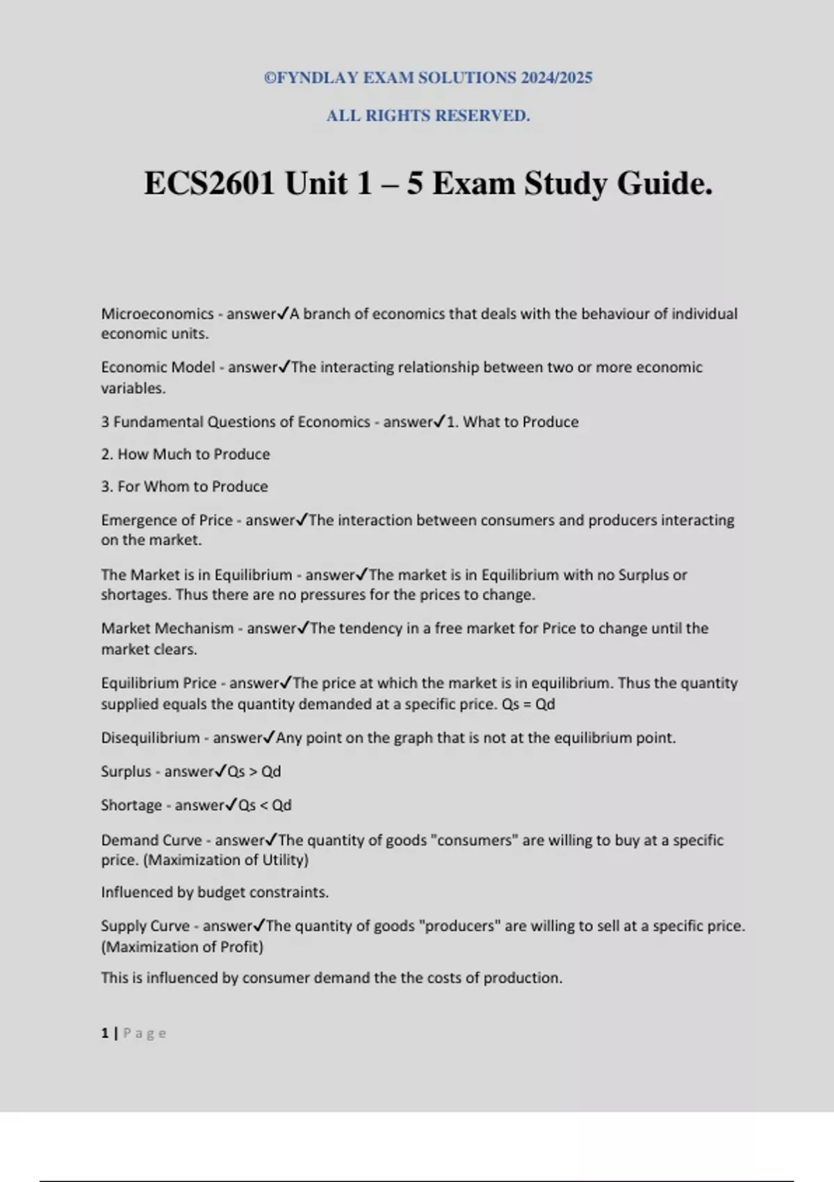 ©FYNDLAY EXAM SOLUTIONS 2024/2025 ALL RIGHTS RESERVED. 1 | P a g e ECS2601 Unit 1 – 5 Exam Study Guide. Microeconomics - answerA branch of economics that deals with the behaviour of individual economic units. Economic Model - answerThe interacting relationship between two or more economic variables. 3 Fundamental Questions of Economics - answer1. What to Produce 2. How Much to Produce 3. For Whom to Produce Emergence of Price - answerThe interaction between consumers and producers interacting on the market. The Market is in Equilibrium - answerThe market is in Equilibrium with no Surplus or shortages. Thus there are no pressures for the prices to change. Market Mechanism - answerThe tendency in a free market for Price to change until the market clears. Equilibrium Price - answerThe price at which the market is in equilibrium. Thus the quantity supplied equals the quantity demanded at a specific price. Qs = Qd Disequilibrium - answerAny point on the graph that is not at the equilibrium point. Surplus - answerQs > Qd Shortage - answerQs < Qd Demand Curve - answerThe quantity of goods "consumers" are willing to buy at a specific price. (Maximization of Utility) Influenced by budget constraints. Supply Curve - answerThe quantity of goods "producers" are willing to sell at a specific price. (Maximization of Profit) This is influenced by consumer demand the the costs of production.
