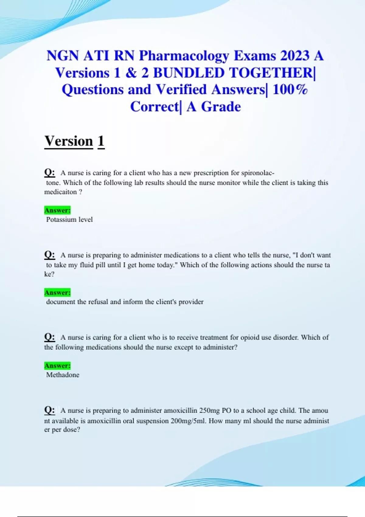 NGN ATI RN Pharmacology Exams 2023 A Versions 1 & 2 BUNDLED TOGETHER| Questions and Verified Answers| 100% Correct| A Grade Version 1 Q: A nurse is caring for a client who has a new prescription for spironolac- tone. Which of the following lab results should the nurse monitor while the client is taking this medicaiton ? Answer: Potassium level Q: A nurse is preparing to administer medications to a client who tells the nurse, "I don't want to take my fluid pill until I get home today." Which of the following actions should the nurse take? Answer: document the refusal and inform the client's provider Q: A nurse is caring for a client who is to receive treatment for opioid use disorder. Which of the following medications should the nurse except to administer? Answer: Methadone Q: A nurse is preparing to administer amoxicillin 250mg PO to a school age child. The amount available is amoxicillin oral suspension 200mg/5ml. How many ml should the nurse administer per dose? Answer: 6.3mL Q: A nurse is providing teaching to a client who has a gastric ulcer and a new prescription for ranitidine. Which of the following instructions should the nurse include? Answer: "report yellowing of the skin" Q: A nurse is assessing a client who is receiving epoetin alfa to treat anemia. Which of the following findings should the nurse monitor? Answer: Increased BP Q: A nurse contacts a client's provider on the telephone to obtain a prescrip- tion for pain medication. Which of the following actions should the nurse take? Answer: Have the provider spell out the unfamiliar medication names Q: A nurse is providing teaching to a client who is begin taking oxybutynin for urinary incontinence. Which of the following adverse effects should the nurse include in the teaching? SATA Answer: A. dry mouth C. blurred vision E. dry eyes Q: A nurse is planning care for a client who is receiving mannitol via continu- ous IV infusion. The nurse should monitor the client for which of the following adverse effects? Answer: bibasilar crackles Q: A nurse is teaching a client about cyclobenzaprine. Which of the following client statements should indicate to the nurse that the teaching is effective? Answer: "I will taper off the medication before discontinuing it" Q: A nurse is preparing medication instructions for a client who is receiving end of life care and their family. The client has a prescription for fentanyl patches. Which of the following information regarding the manifestations and use of fentanyl should the nurse include in the instructions? Answer: Take a tool softener daily will be needed Q: A nurse is caring for a client who is experiencing acute alcohol withdrawal. For which of the following client outcomes should the nurse administer chlor- diazepoxide? Answer: prevent delirium tremens Q: A nurse is caring for a client who is receiving haloperidol. Which of the following findings should the nurse identify as an adverse effect of the med- ication? Answer: Akathisia Q: A nurse is teaching a client about the use of risedronate for the treatment of osteoporosis. The nurse should identify which of the following statements as an indication that the client understands the teaching? Answer: "I should sit up for 30 minutes after taking the risedronate" Q: A nurse is caring for a 20 year old female client who has a prescription for isotretinoin for severe nodulocystic acne vulgaris. Before the client can obtain a refill, the nurse should advise the client that which of the following tests is required? Answer: pregnancy test Q: A nurse is instructing a client on the application of nitroglycerin trans- dermal patches. Which of the following statements by the client indicates an understanding of the teaching? Answer: "I will take the patch off right after my evening meal" Q: A nurse is reviewing the medication list of a client who wants to begin tak- ing oral contraceptives. The nurses should identify that which of the following client medications will interfere with the effectiveness of oral contraceptives?- Answer: carbamazepine