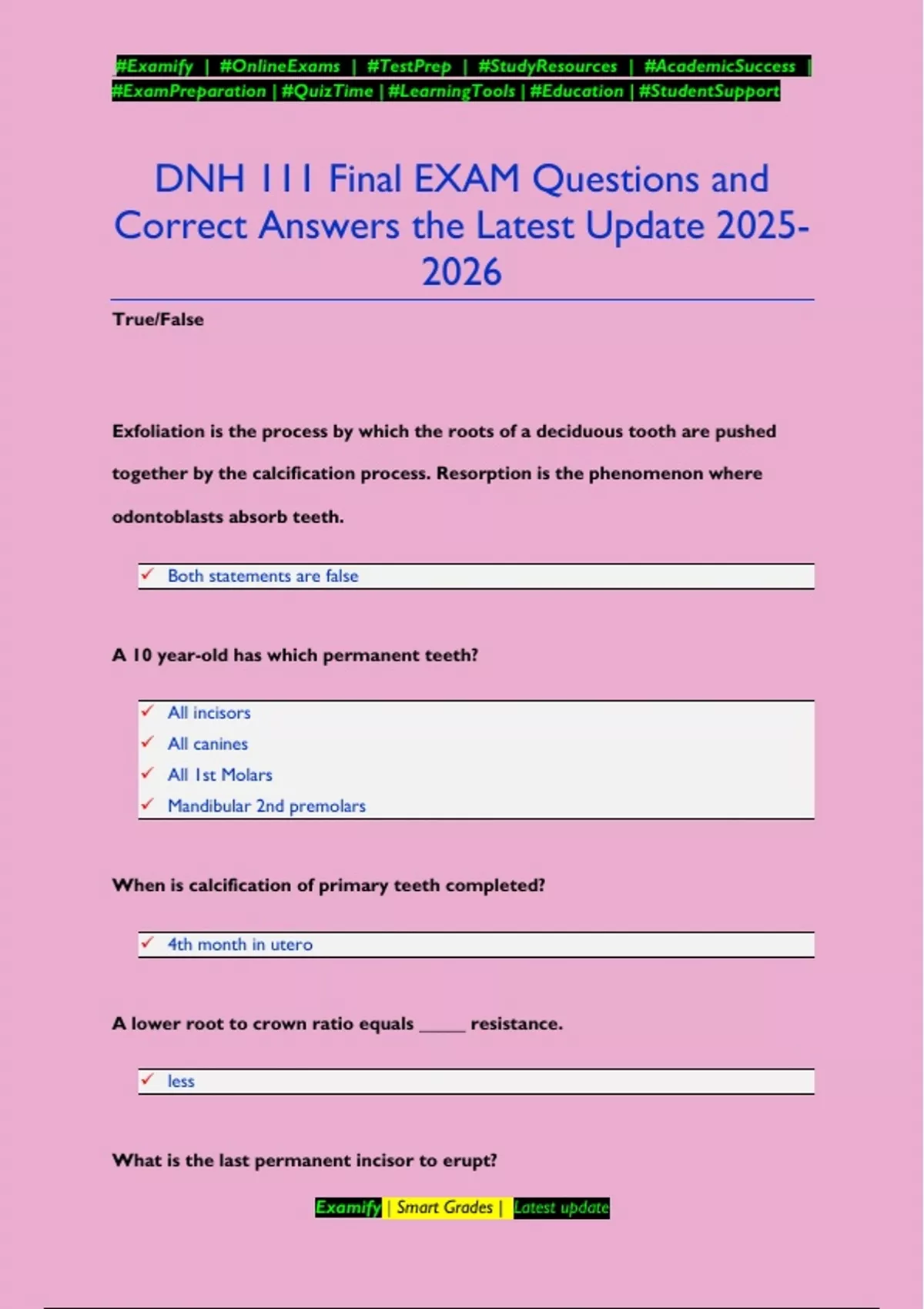 DNH 111 Final EXAM Questions and