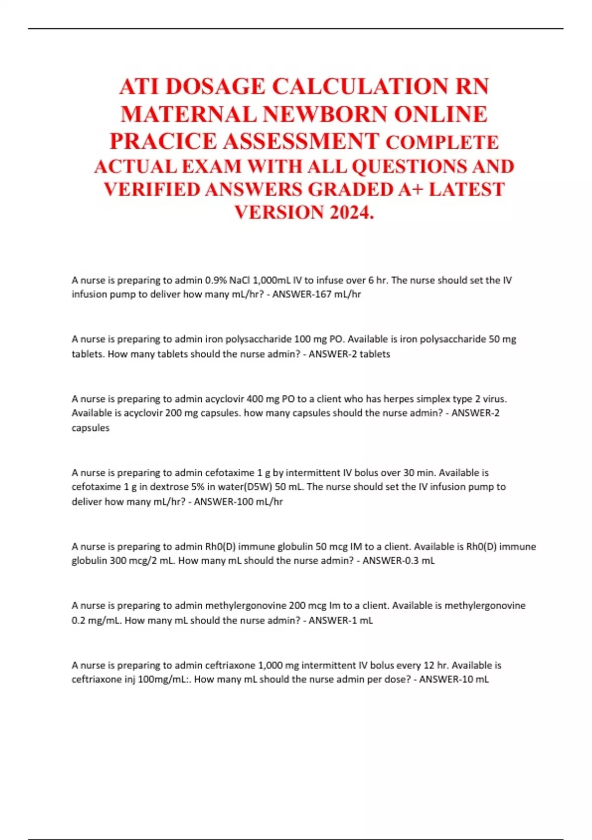 ATI DOSAGE CALCULATION RN MATERNAL NEWBORN ONLINE PRACICE ASSESSMENT COMPLETE ACTUAL EXAM WITH ALL QUESTIONS AND VERIFIED ANSWERS GRADED A+ LATEST VERSION 2024