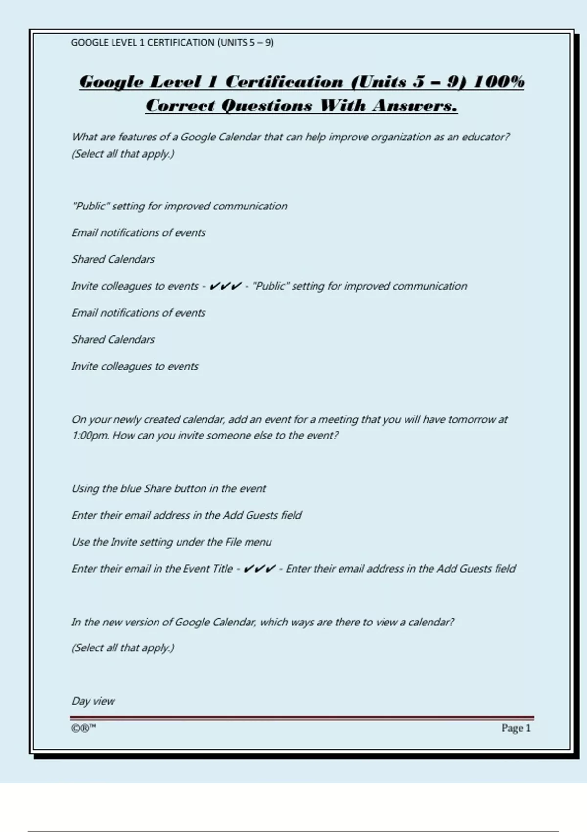 Google Level 1 Certification (Units 5 – 9) 100% Correct Questions With Answers.