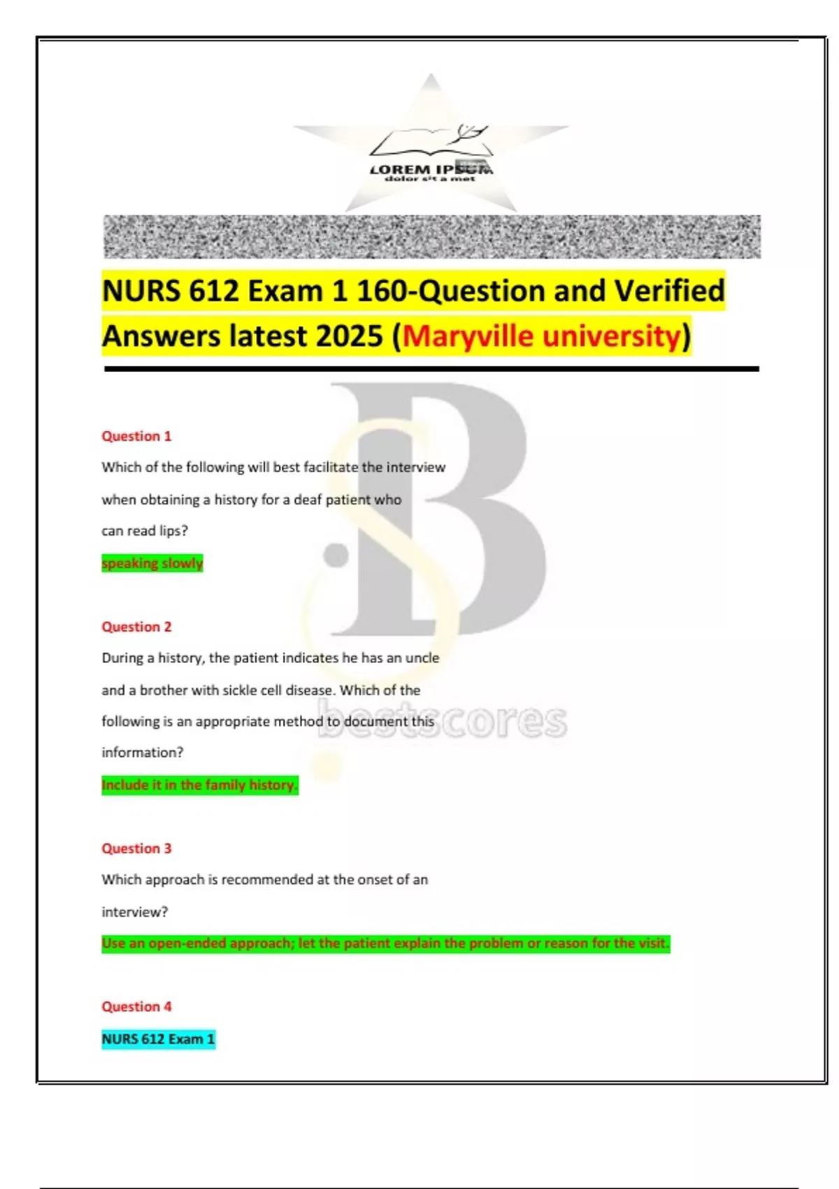 NURS 612 Exam 1 160-Question and Verified Answers latest 2025 (Maryville university) Question 1 Which of the following will best facilitate the interview when obtaining a history for a deaf patient who can read lips?