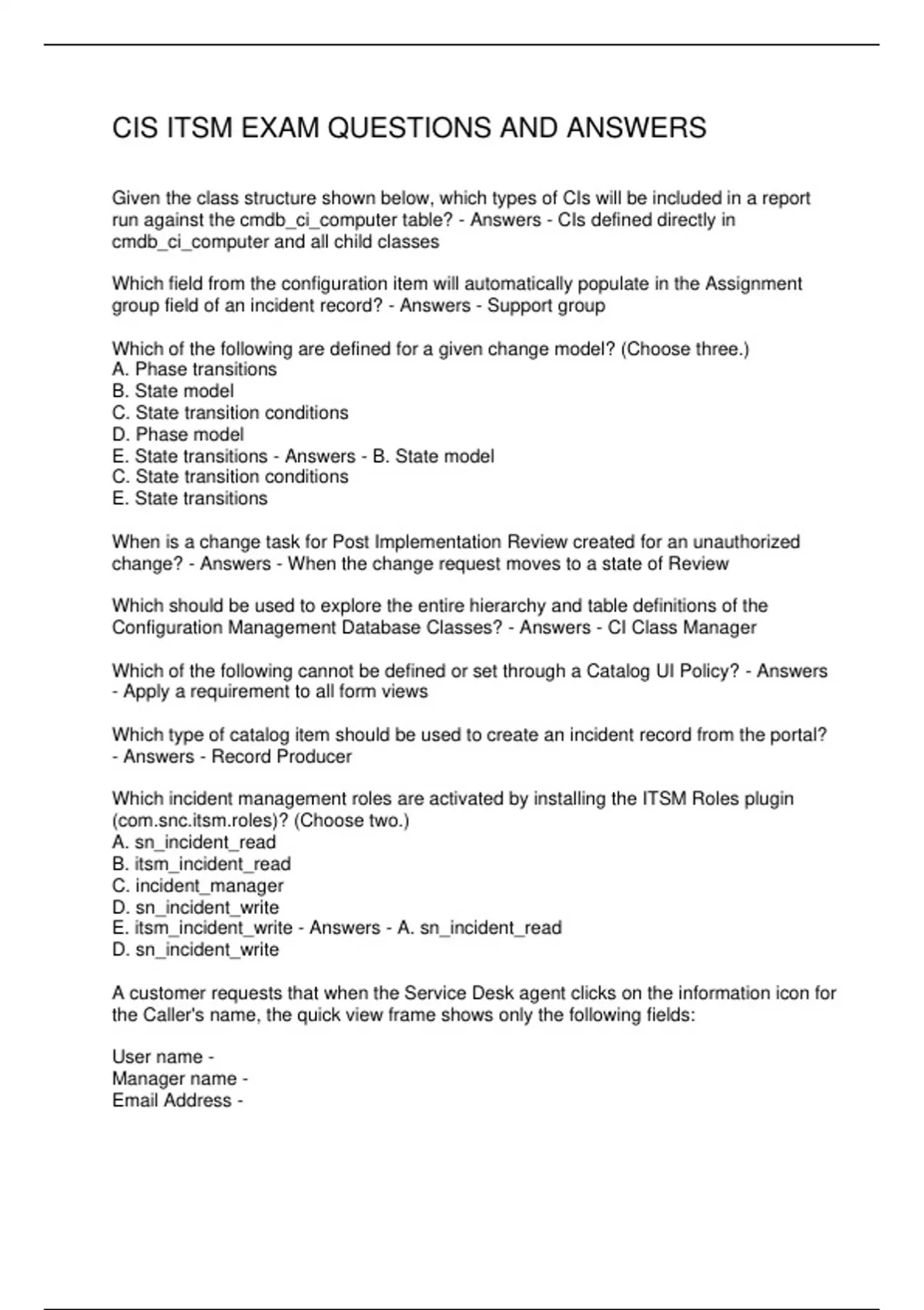 CIS ITSM EXAM QUESTIONS AND ANSWERS