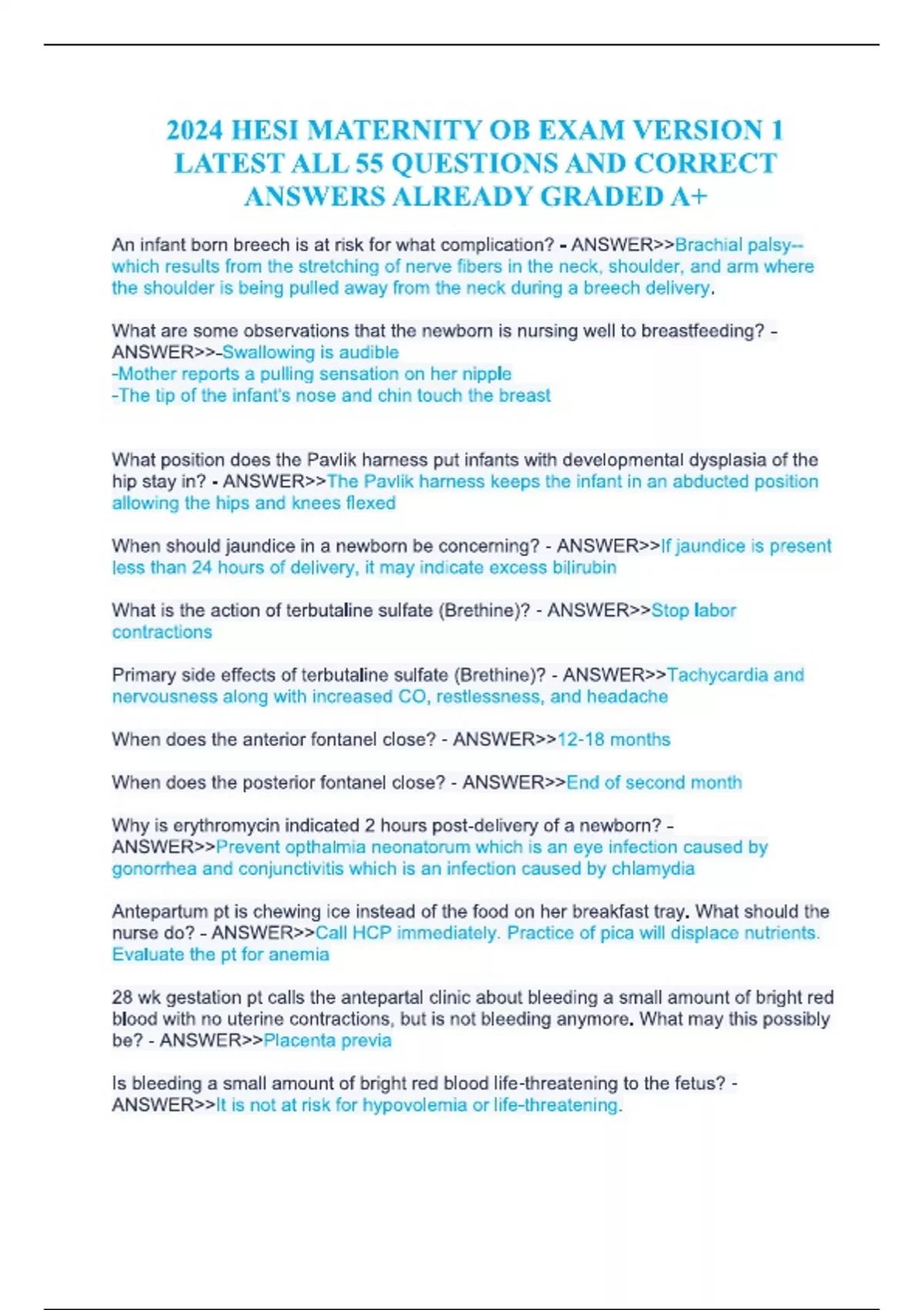 2024 HESI MATERNITY OB EXAM VERSION 1 LATEST ALL 55 QUESTIONS AND CORRECT ANSWERS ALREADY GRADED A+