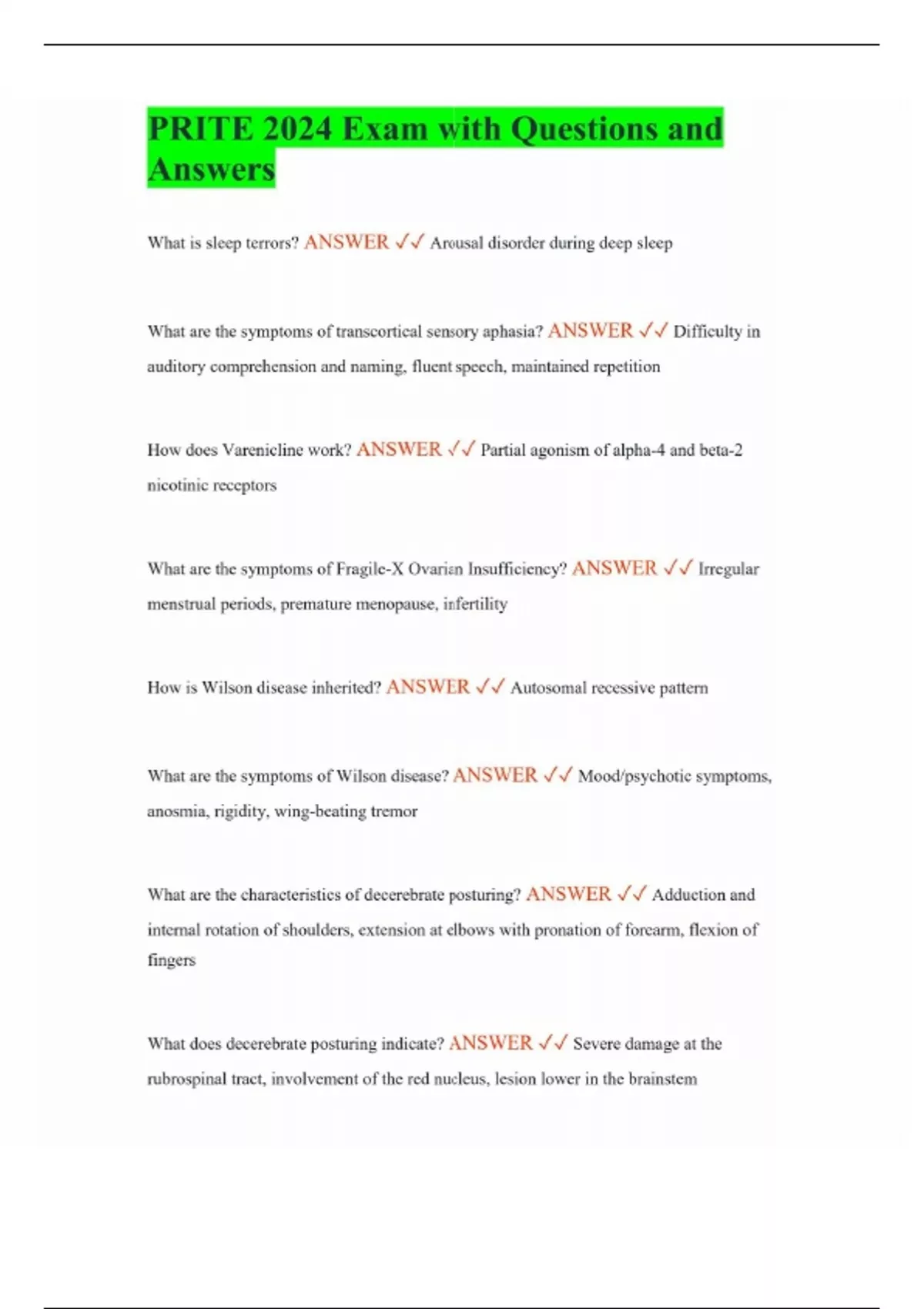 PRITE 2024 Exam with Questions and Answers What is sleep terrors? ANSWER Arousal disorder during deep sleep What are the symptoms of transcortical sensory aphasia? ANSWER Difficulty in auditory comprehension and naming, fluent speech, maintained repetition How does Varenicline work? ANSWER Partial agonism of alpha-4 and beta-2 nicotinic receptors What are the symptoms of Fragile-X Ovarian Insufficiency? ANSWER Irregular menstrual periods, premature menopause, infertility How is Wilson disease inherited? ANSWER Autosomal recessive pattern What are the symptoms of Wilson disease? ANSWER Mood/psychotic symptoms, anosmia, rigidity, wing-beating tremor What are the characteristics of decerebrate posturing? ANSWER Adduction and internal rotation of shoulders, extension at elbows with pronation of forearm, flexion of fingers What does decerebrate posturing indicate? ANSWER Severe damage at the rubrospinal tract, involvement of the red nucleus, lesion lower in the brainstem